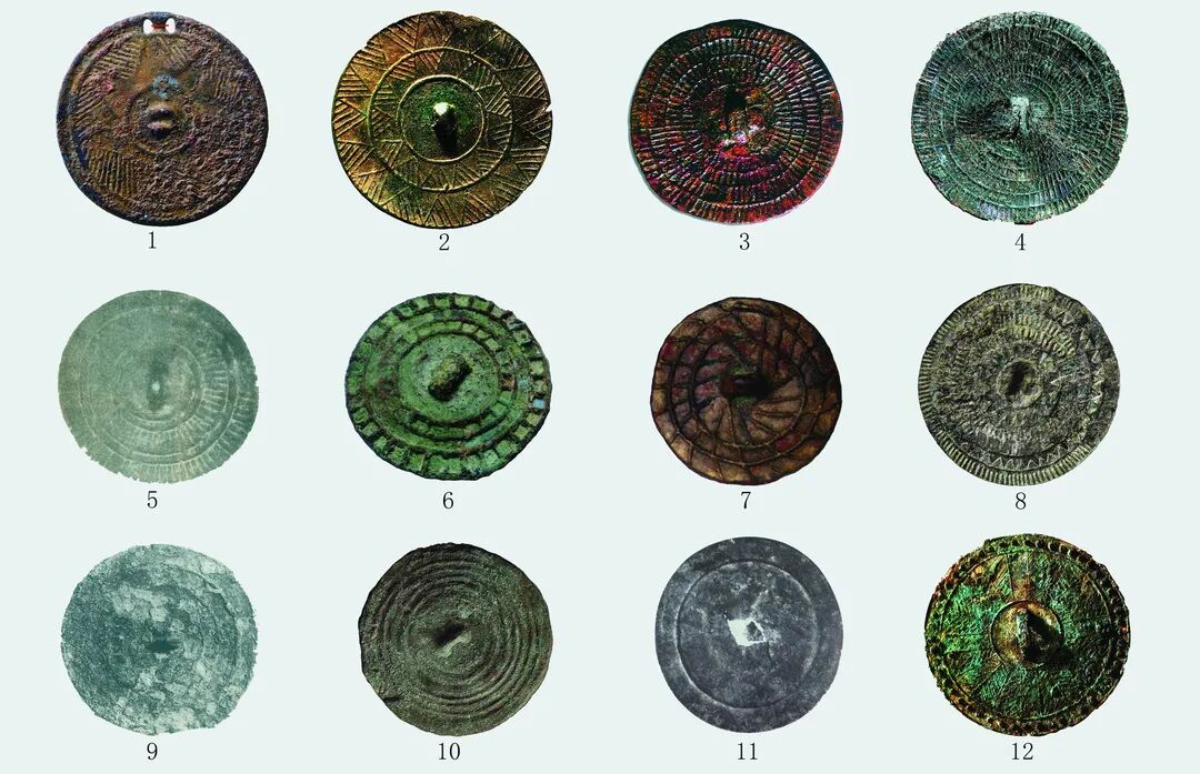 1.青海贵南尕马台M25:6七角星纹镜;2.国家博物馆藏重圈多角星纹镜;3.新疆哈密天山北路墓地M483铜镜;4.妇好墓M5:45;5.鄂尔多斯收集品E·1639;6.新疆和静莫呼查汗墓地IM128:2;7.乌鲁木齐萨恩萨伊墓地M113:7;8.河北滦县后迁义1999LQT2②M4:7;9.安阳大司空村南地M25:20;10.河北滦县后迁义1999LQT2②M4:6;11.长沙楚墓M17:4;12.妇好墓M5:786