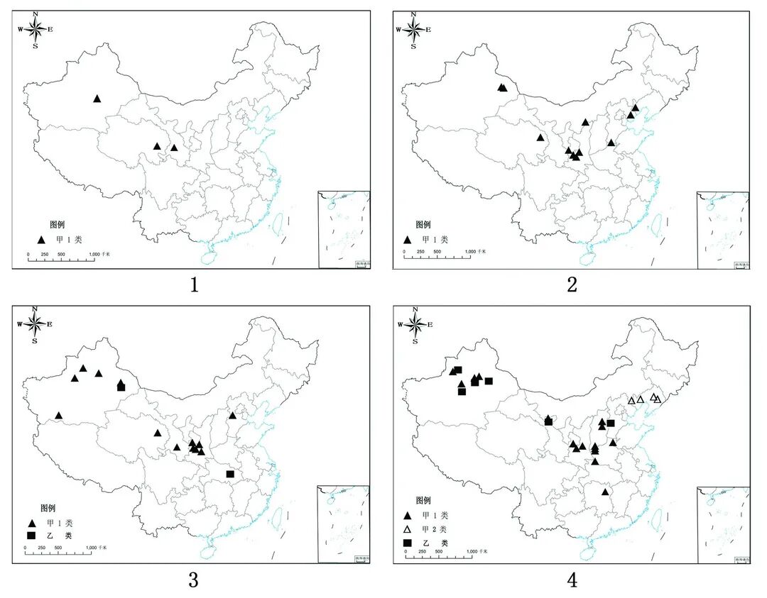1.第一期铜镜分布;2.第二期铜镜分布;3.第三期铜镜分布;4.第四期铜镜分布