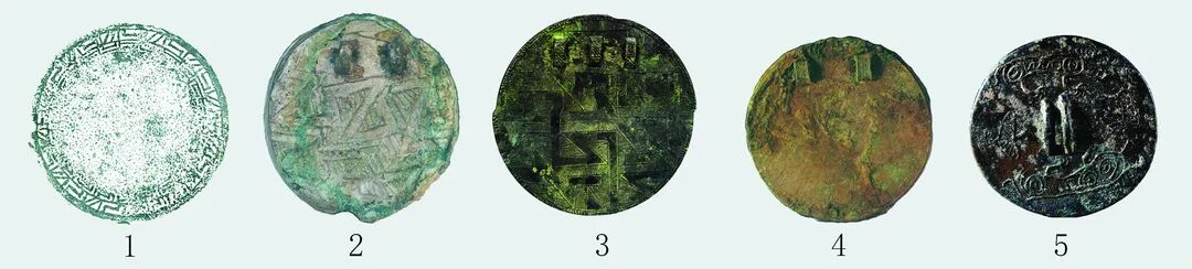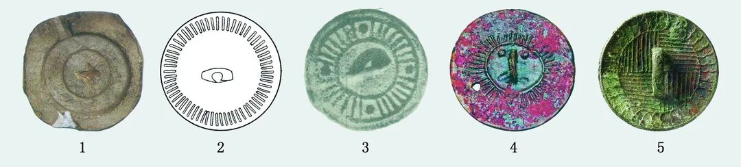 1.张掖黑水国遗址出土石质镜范;2.喀左道虎沟墓地出土铜镜;3.淳化赵家庄CHZHM1铜镜;4.哈密天山北路文化墓地出土铜镜;5.侯家庄西北岗HPKM1005出土铜镜