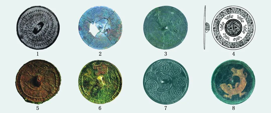 1.甘肃漳县农副收购站收集铜镜;2.陕西凤翔秦景公墓铜镜;3.山西太原晋国赵卿墓M251:400;4.山西新绛东柳泉墓地铜镜;5.新疆和静察吾乎IVM165:8;6.新疆和静察吾乎IVM114:13;7.柏林东亚艺术博物馆藏镜;8.哥本哈根装饰艺术博物馆藏镜