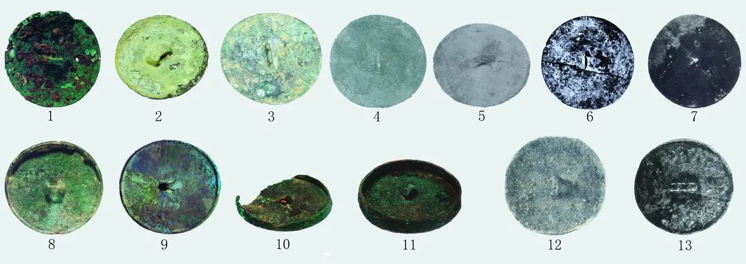 1.新疆哈密天山北路墓地M483铜镜;2.新疆和静莫呼查汗墓地ⅠM10:2;3.甘肃崇信于家湾84CYM38:3;4.陕西旬邑下魏洛M1:17;5.新疆和静察吾乎Ⅰ M206:4;6.河南淅川下寺楚墓M3:25;7.湖南长沙楚墓M6:5;8.新疆焉不拉克墓地M64出土铜镜;9.新疆特克斯阔克苏西IIM47:1;10.新疆萨恩萨伊墓地M89:3;11.新疆萨恩萨伊墓地M106:5;12.内蒙古宁城南山根M102:34;13.河南三门峡上村岭虢国墓地M1650:1.1