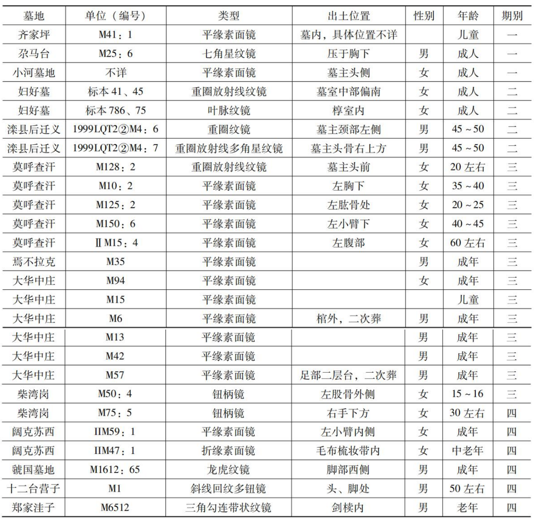 早期铜镜的功能视地域和时代而异,很难一概而论,以往的研究或侧重于其初始功能,或是对比西北与中原以反映铜镜由西北游牧民族向中原的输入,对铜镜功能因时因地而产生的多样性重视不足。所以在分期的基础上,我们全面考察典型墓葬出土早期铜镜的详细位置、使用对象等信息(表二),分析其具体功能。