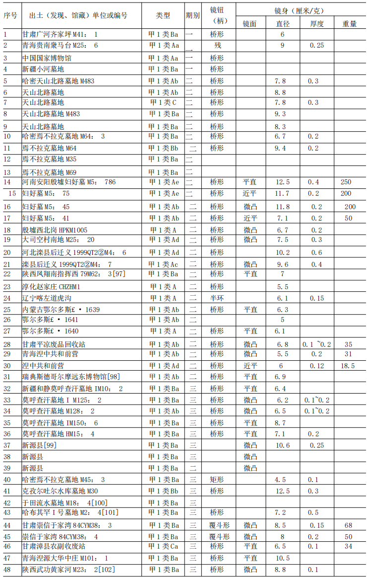 [9] 由于早期铜镜的合金分析尚不充分,本文仍以形制为主要标准,尺寸过小者(如直径4.5厘米以下)不作标本。