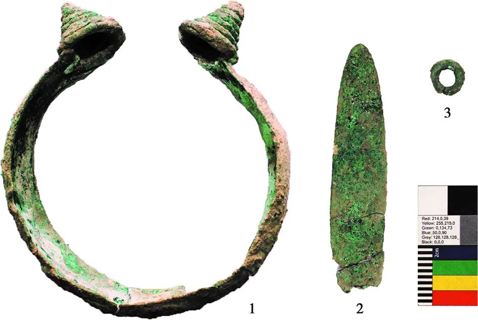 阿敦乔鲁遗址F1及墓地使用年代在公元前18世纪至公元前16世纪范围内,使安德罗诺沃文化共同体在东部地区的年代认知提前了数个世纪。[8]阿敦乔鲁出土部分铜器的锡含量在5%~14%之间,考虑到大部分铜器完全锈蚀导致锡含量偏高的因素,这个分布区间是符合所谓安德罗诺沃铜器锡含量在3%~10%之间的特点。安德罗诺沃文化的耳环和镯饰经常有螺旋状的尾端,其生产都应用了高水平的锻造技术,[9]新疆所发现的这4件臂钏无论器型或技术工艺都符合上述特点。考虑到与臂钏同出的釉砂是通过欧亚草原更大范围的交流互动背景下引入的,[10]推测阿敦乔鲁等遗址的铜器可能也由同样的方式出现在新疆,而非本地生产。