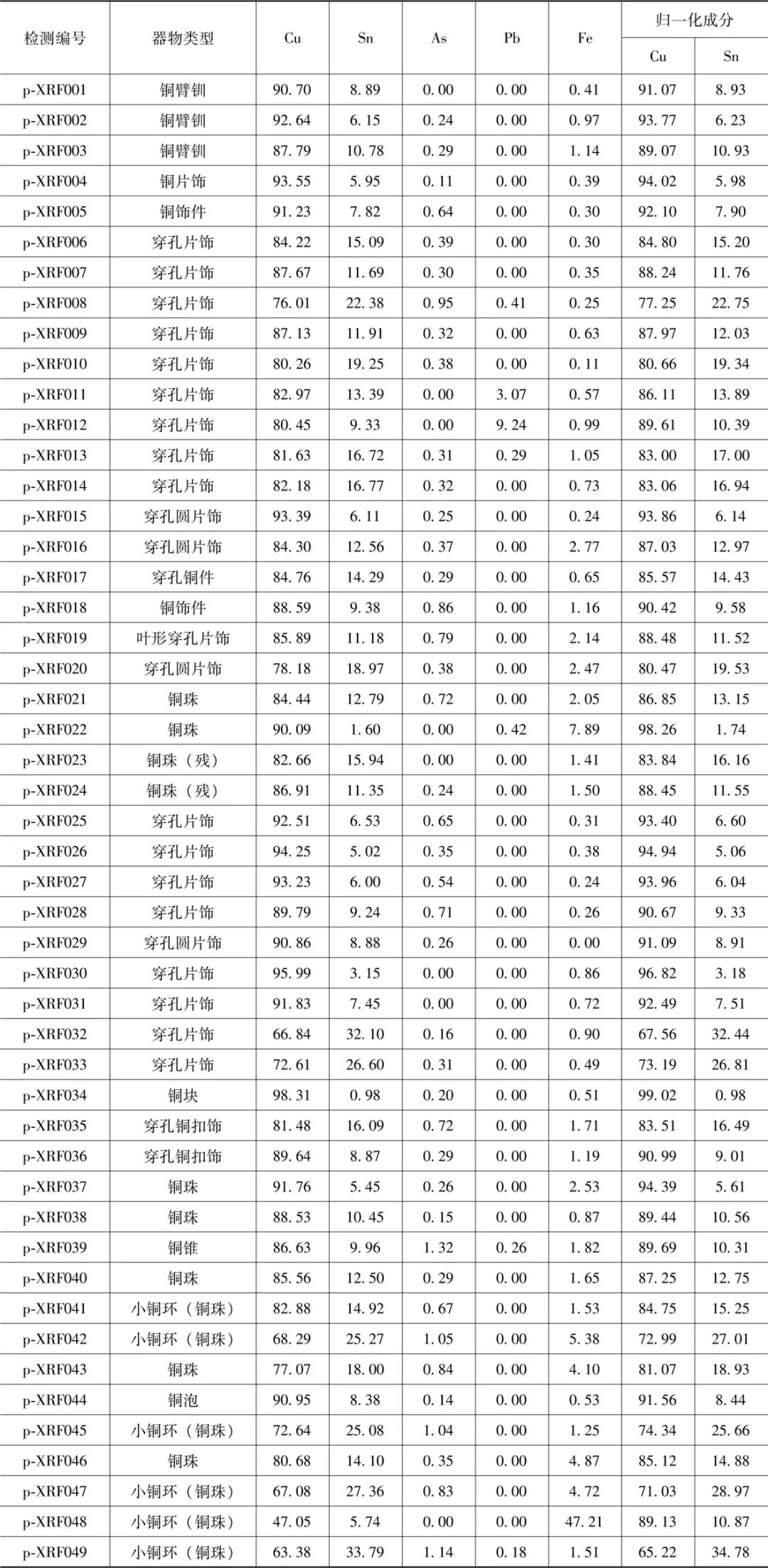注:由于全部器物锈蚀严重,p-XRF只能测试到表面锈蚀层,此表数据仅作为定性参考。