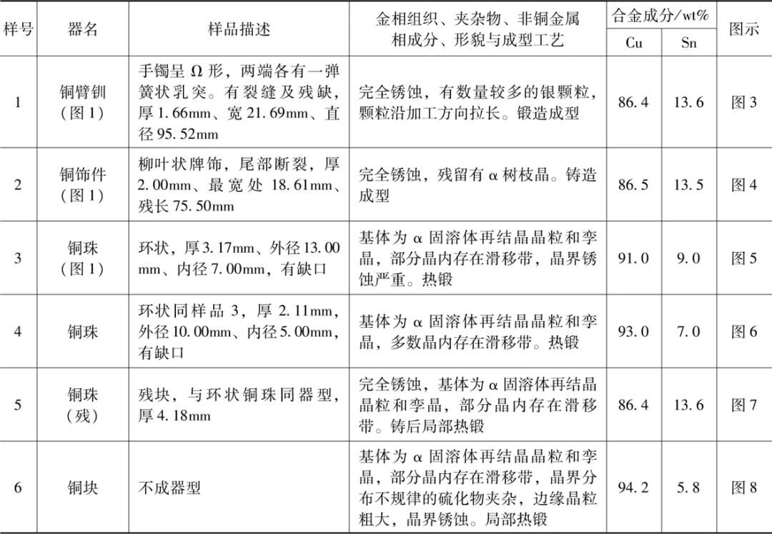 此6件样品中,锡含量在5%~14%之间,其中样品1铜臂钏与样品6铜珠器型不同,但锡含量相似;样品3、样品4与样品6虽器型都为铜珠,但成分却相差较大,且样品3所含夹杂物为铅颗粒,样品6所含夹杂物为银颗粒。从分析结果来看,合金材质中的铜锡配比与铜器器型并无明显的对应关系。