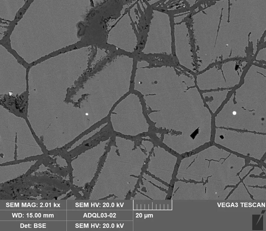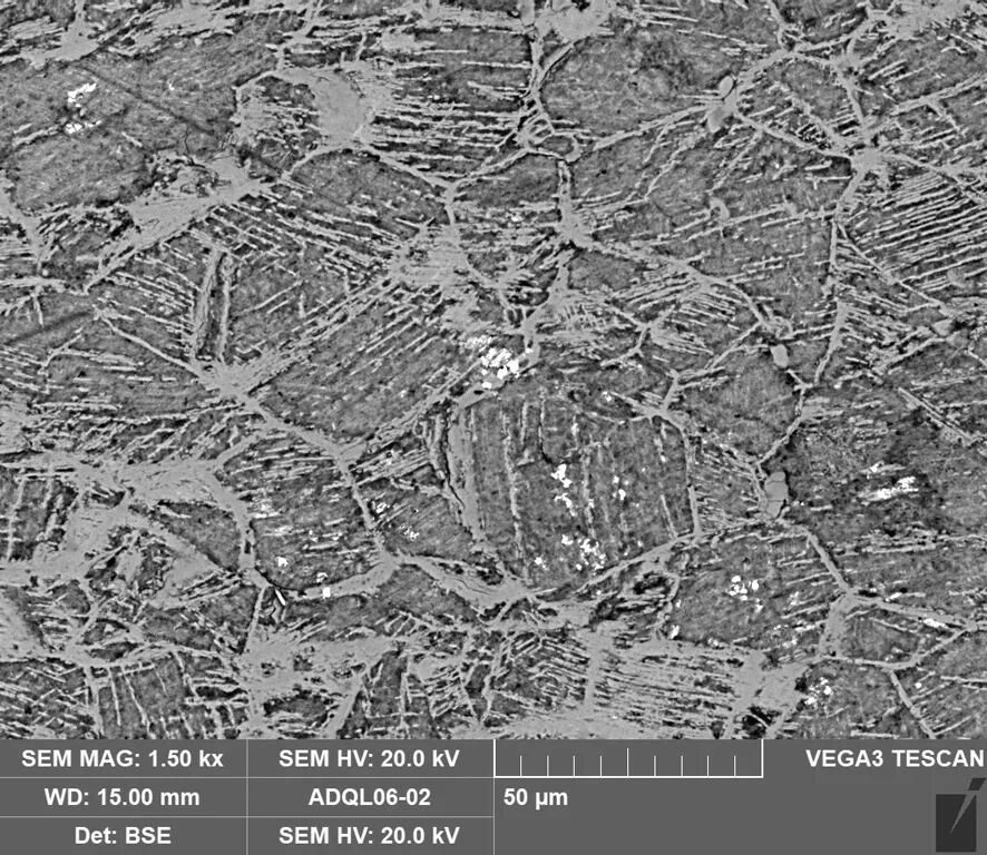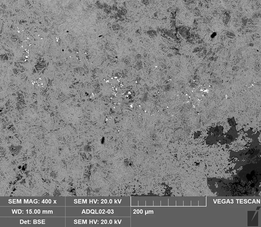 图4(右) 样品2扫描电镜背散射电子图像,残留有α树枝晶,其中的白亮相为银,未见其拉长变形。