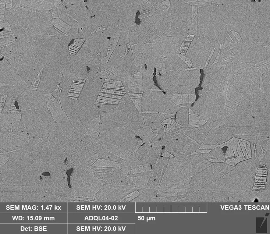 图6(右) 样品4扫描电镜背散射电子图像,基体为α固溶体再结晶晶粒和孪晶,多数晶内存在滑移带,其中灰黑相为硫化亚铜夹杂。