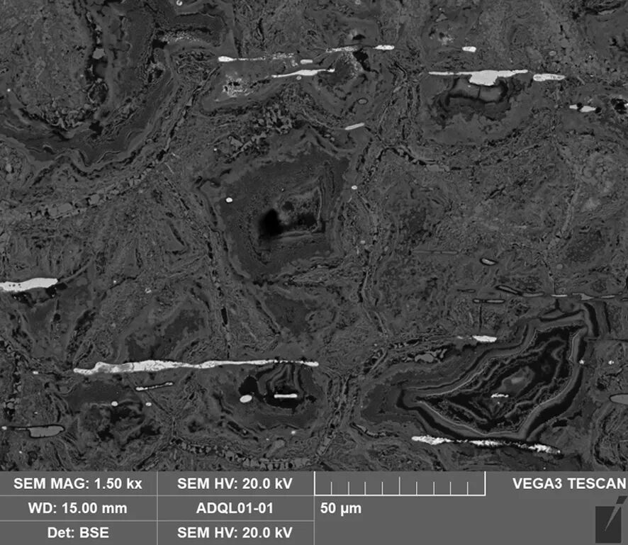 图3(左) 样品1扫描电镜背散射电子图像,其中的长条状白亮相为银,银锻造加工而拉伸延长。