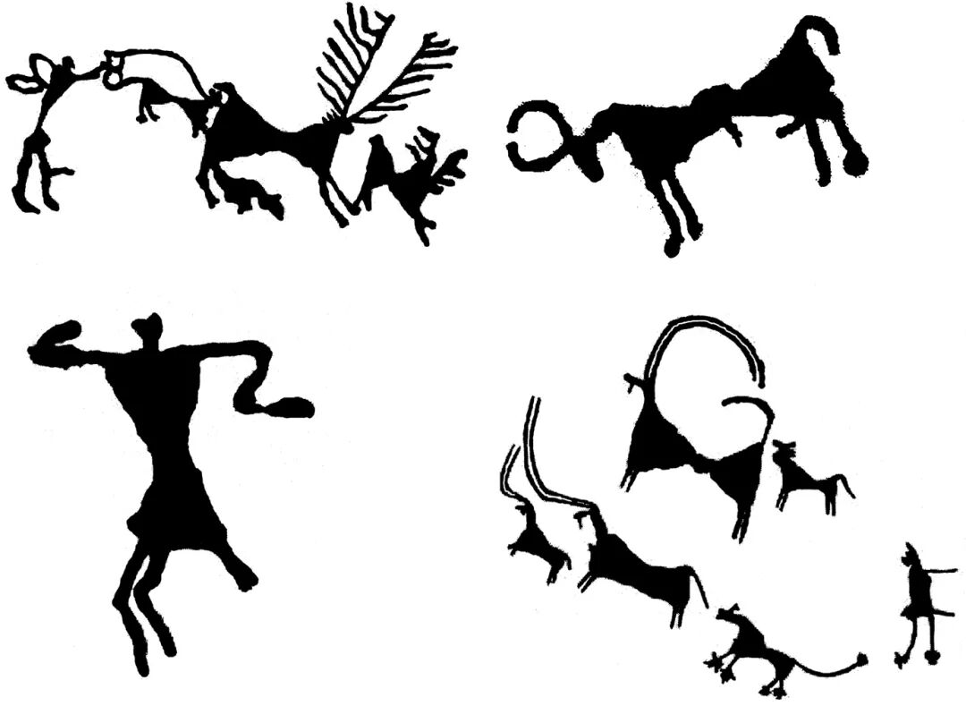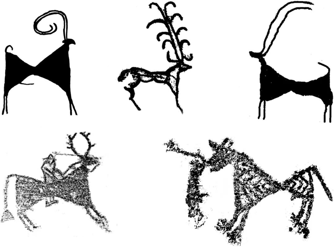 (左下岩画鹿上面所骑的戴帽人物为晚期加刻)