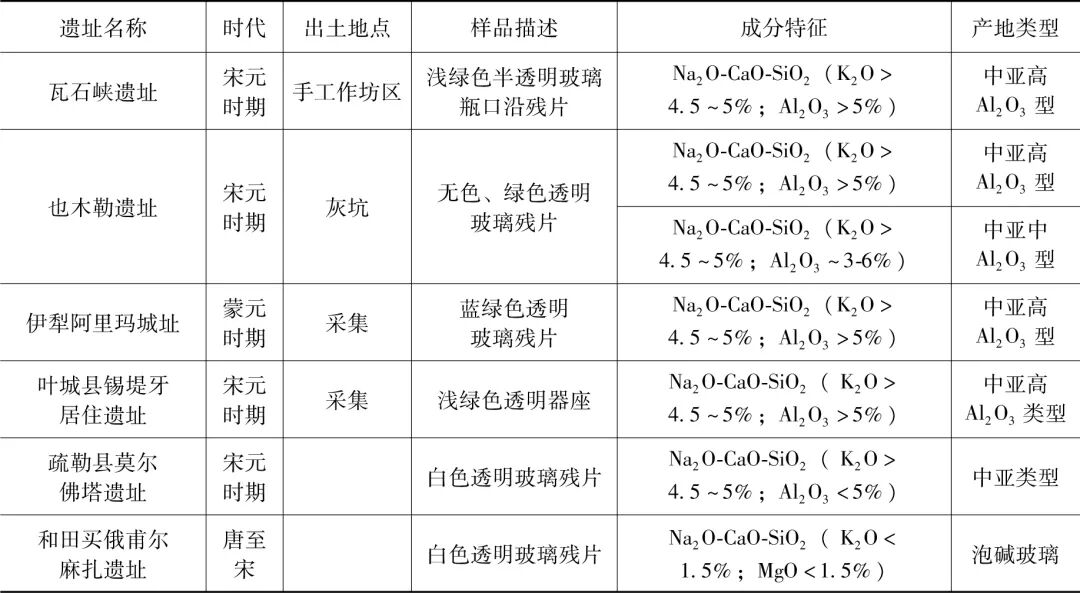 表1 宋元时期新疆地区玻璃器的成分分析信息表