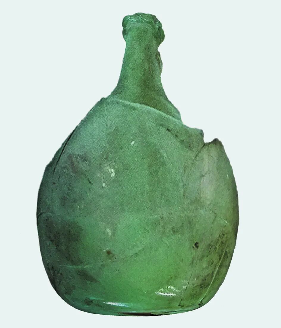 达勒特古城采集到的这件琉璃瓶功能可以与17~19世纪伊朗的马鞍玻璃瓶(Saddle Flask/Persian Bottle)进行对比研究。后者是这一时期玻璃器的典型代表,是伊朗高原再次受威尼斯玻璃影响下诞生的产物。特点包括扁腹、颈部有贴塑玻璃条,与达勒特古城小口细颈瓶的外观大小十分相似,是用于出行饮酒或运输酒类的器具,如下图5(右)所示。研究发现,为了方便运输和减少破损,瓶子外部会包裹编织物,同时颈部的玻璃条可以方便捆绑,是防止坠落的实用性装饰。[25]所以达勒特的小口细颈扁腹瓶,可能是工匠融合当地审美喜好加工成型,造型来源可能是游牧民族使用的皮囊壶,颈部的贴塑是为了捆绑绳索的实用性装饰,由于目前只发现了这一件,无法肯定用于运输,但应该是用于盛放酒、水等液体的器皿。城址中出土的玻璃料块也可以佐证本地加工玻璃器的观点。