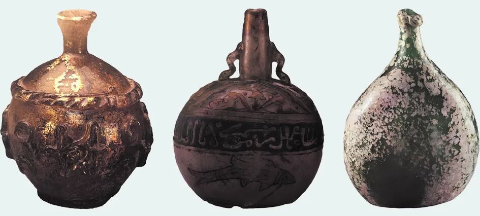 图5 小口圆腹瓶(左);描金马穆鲁克玻璃瓶(中);小口细颈扁腹马鞍瓶(右)