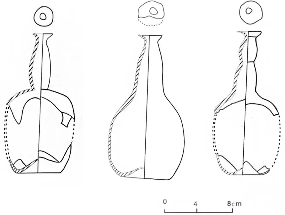 虽然有研究表明先秦时期新疆地区有本地制作玻璃珠的现象,[16]但是没有辅助说明的考古证据,目前学术界的主要观点还是认为宋元以前新疆玻璃制品大多为舶来品。若羌县瓦石峡遗址是新疆迄今为止最早的玻璃作坊,其中出土有木炭、红烧土、玻璃熔块、废料以及大量玻璃残片,但未发现制作玻璃的原料,说明手工作坊区至少存在二次重熔加工玻璃器的情况,可辨识的器型有小口细颈瓶与罐型器残件,其余为素面残片,熔铸水平参差不齐。4件罐型器残件为绿色透明的器盖,造型不明,6件小口细颈瓶通高10~17厘米,浅绿色透明,素面无纹饰,从颈肩处可分为三种形式,第一种为撇口,长颈,颈与肩连接处凹陷,圆肩,鼓腹凹底(左);第二种为撇口,锥形长颈,上颈部微隆,斜肩凹底(中);第三种为撇口,长颈呈葫芦形束腰状,圆肩,鼓腹,凹底(右)。6件玻璃瓶皆为无模吹制成型,内部有细小的砂粒等杂质和气泡,器壁厚薄不均,凹底与圆唇的厚度可达5毫米,腹部极薄处可达1毫米左右,[17]所以不具备运输的功能,结合尺寸大小,可能是盛放酒水的器物。