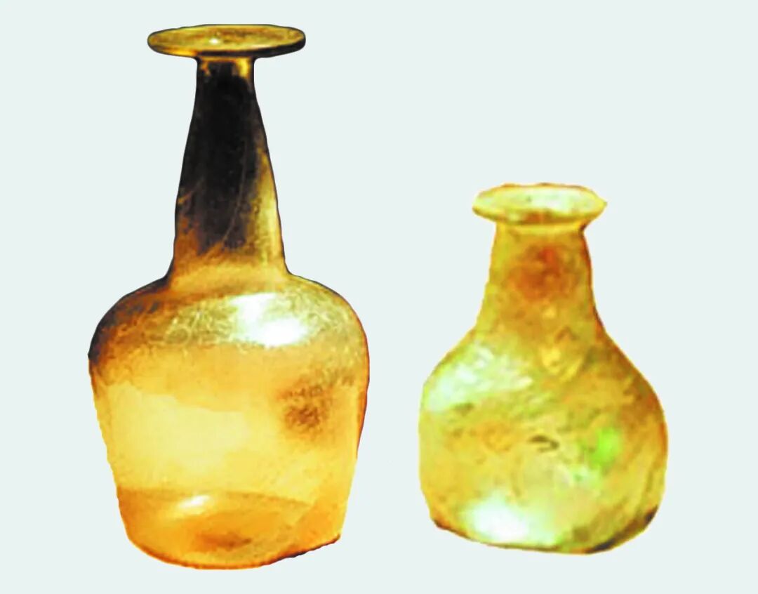 上述三类器物与西亚的小口细颈瓶有相似之处,后者在西亚各个生产中心都十分常见,形制大小丰富多样,素面无装饰,尺寸大于7厘米的一般都是实用器皿。制作水平普遍不高,有腹部壁薄、颈口部厚的情况。[18]由于等级低数量大,质地易碎,只有少数能够复原器型,所以相关描述寥寥无几,难以找到外观一致的典型器物,但在土耳其Serçe Limani海岸的11世纪的沉船里发现了很多日常生活玻璃器,有一类槌瓶(mallet-shaped bottle)与瓦石峡遗址玻璃瓶第一种类型相似,如下图3(左),具备长颈微隆、圆肩、凹底的特点。[19]另外有小型细颈瓶与瓦石峡第二种类型的器型相似,如下图3(右)所示,具备侈口,长颈微隆、斜肩、凹底的器型特点。由于这一时期河中地区较为完整玻璃器的资料公布较少,少数研究中表示受波斯地区的影响很深,器型种类上十分相似,[20]所以河中地区的器型功用可以由西亚地区玻璃器为代表。但是第三种类型的细颈瓶还没有发现与其相似的西亚玻璃器,尤其颈部中间的收敛具有特殊性,无法推测其具体用途,可能是减缓液体挥发的实用性装饰,这件器物应该是新疆本地工匠创造出的特有器物。