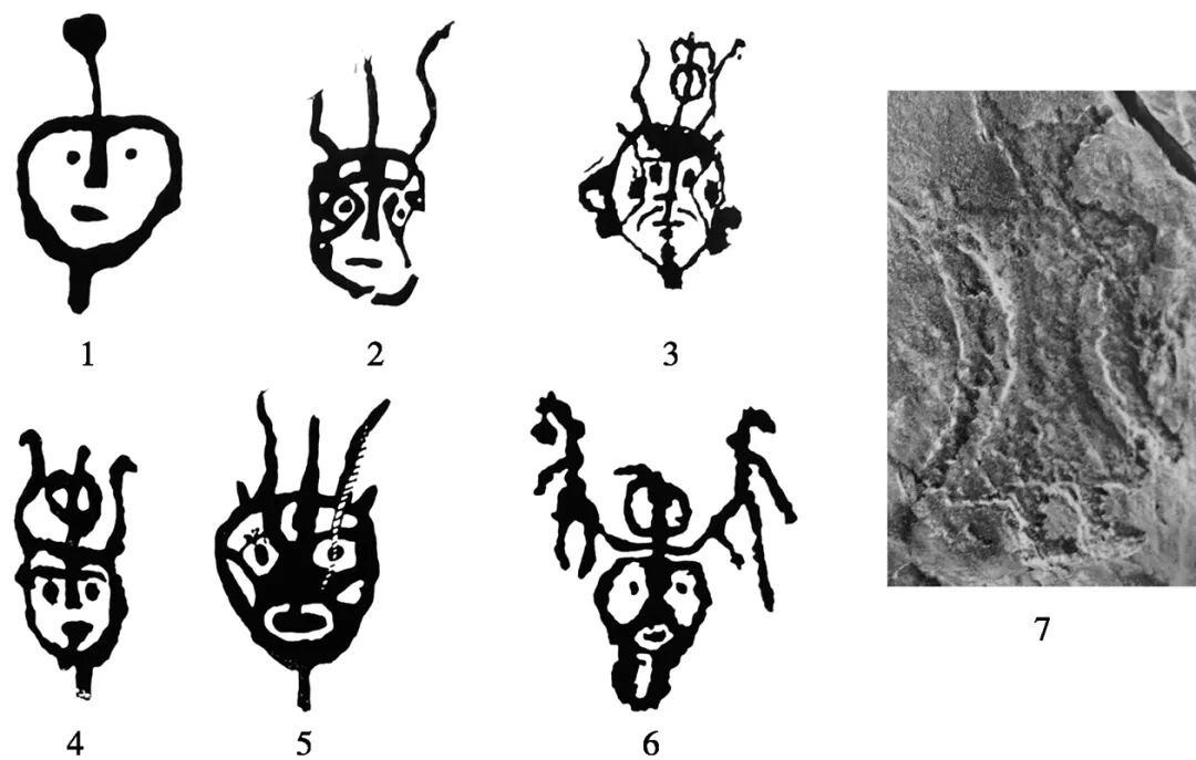 关于此类人物形象的功能众说纷纭,但一般认为与某种信仰或习俗有关。康家石门子岩画被直呼为“生殖崇拜岩画”,[27]哈密天山北路的彩陶人物画被认为可能是巫师形象,[28]叶尼塞河流域的石碑和岩画人物,或被认为表示包含天、地、地下在内的世界之轴(world axis),或象征日月轮回,[29]或与原始萨满教有关。[30]其实生殖崇拜也好,世界之轴也好,日月轮回也好,都可以视为是原始萨满精神系统的组成部分,而中国话语中的“巫”或者与萨满本来就大体是一回事。因此,将上述角状—羽状头饰、“天眼”、纹面等与原始萨满装饰联系,或者与萨满教的起源相关,不失为一种很有见地的解释。[31]