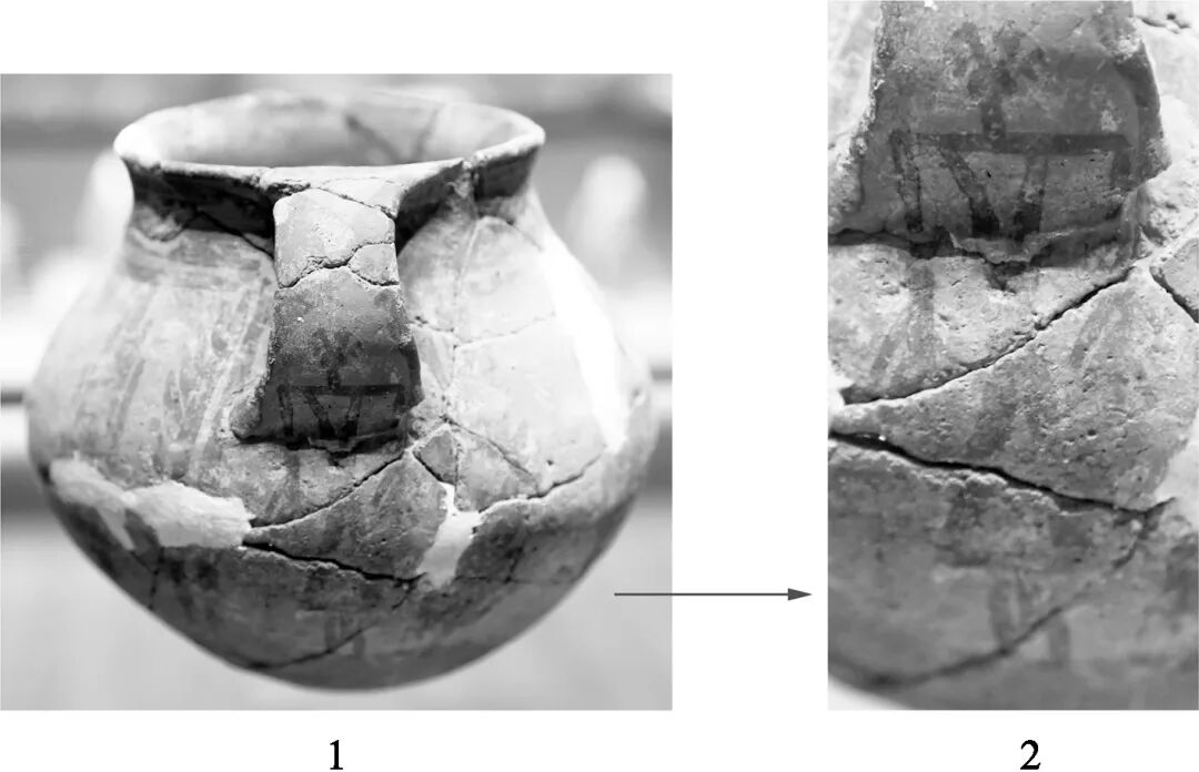 哈密天山北路文化,位于新疆哈密盆地和巴里坤盆地,绝对年代约在公元前2000~前1300年。[7]哈密天山北路墓地的一件黑彩彩陶双耳罐上,在双耳及以下部位,各彩绘站立人物一个。[8]其中一人头部彩绘剥蚀不清,仔细观察头应为粗圆点,不见五官,上伸出一对正反“F”形羽状饰,[9]身体为两个对顶三角形,平肩垂臂,手部呈树枝状,双短腿,二脚偏于一侧,中间有竖道应为阳具(图二)。