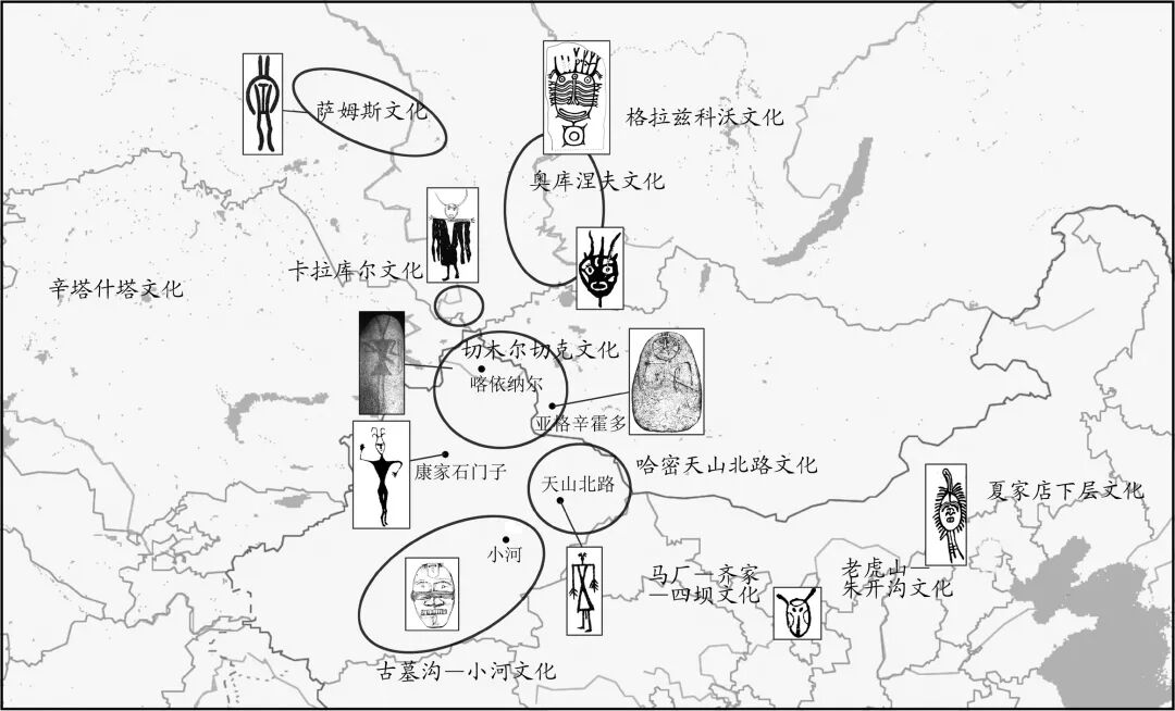 距今4000年前后的青铜时代,在新疆地区的切木尔切克文化、哈密天山北路文化、古墓沟—小河文化等当中,有一种头面装饰奇特的萨满式人物形象。这类形象在大体同时的俄罗斯阿尔泰地区奥库涅夫文化和卡拉库尔文化等当中有着更为丰富的发现,类似形象还见于新疆康家石门子,以及阿尔泰山、天山、贺兰山、阴山等地区岩画。推测这些人物形象不但彼此时代相近、互相存在联系,而且可能具有共同的萨满特征的信仰底层。