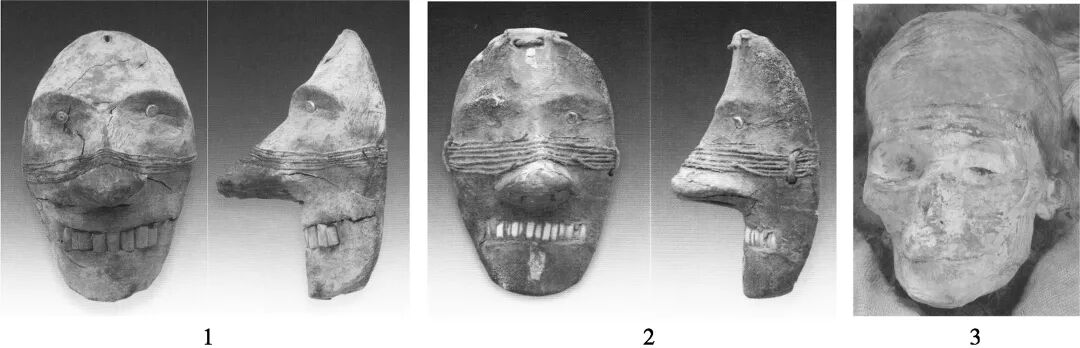 古墓沟—小河文化[10]位于从罗布泊至克里雅河流域的塔里木盆地,绝对年代约在公元前2100~前1450年,[11]其中小河墓地上部第1、2层年代约前1650~前1450年。[12]小河墓地有一种随葬的木人头像,一般置于墓主人胸部,高10厘米左右,高鼻深目,尤其鼻子高耸夸张,镶嵌小白珠为眼珠,以羽管为牙,在鼻梁至双颊横搭7道细线绳(图三,1、2)。有趣的是,随葬木人头像的M13、M24等的墓主人也是“额至鼻部绘有红色的横线”,其中M13“额部的3道最明显,鼻梁至上唇的几道断断续续,不甚清晰”(图三,3)[13]。可见,木头人像面部的线绳,很可能表示的就是纹面形象。
