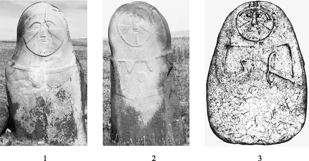 切木尔切克文化以中国新疆阿勒泰地区为中心,涉及周边的塔城、昌吉,以及蒙古西部的乌列盖省、科布多省等地,绝对年代约在公元前2500~前1500年。[3]其萨满式人物形象主要见于墓前石碑,[4]以阿勒泰喀依纳尔1号墓地石人为代表。[5]该墓地于茔院墓围之前立有5尊人像石碑,真人大小,圆顶长方体,头颈稍有分界,正面浅浮雕出圆头,以及眉眼鼻口,双手抚胸腹。值得注意的是,其双颊有两个横三角形浅浮雕饰,有的胸部正中有圆形浅浮雕饰,像是纹面着胸饰的萨满形象(图一,1、2)。在紧邻阿勒泰的蒙古科布多省亚格辛霍多(Ягшийн ходоо)墓地,[6]也发现有类似的石碑人像,只是除了纹面,头上还有双短竖线式的角状—羽状饰,左右手各持弓和钩形器(图一,3)。
