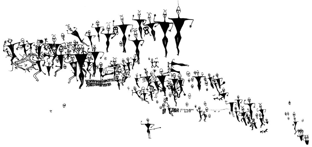 新疆岩画也有和上述年代明确的考古资料类似的萨满式人物形象,以呼图壁康家石门子岩画最具代表性。这幅岩画在100余平方米的横长条形空间上,凿刻了大大小小一二百个人像或人头,以及对马图像等(图五)[20]。人物形态各异,突出特征就是绝大多数头顶有一对角状—羽状装饰(图四,5左、7),也有个别为两对羽状饰(图四,6),或在头顶正中有一枝角状—羽状装饰(或者简化的高冠)(图四,5右),上身呈倒三角形,手臂一举一垂似“卐”字形。岩画的性特征非常突出,女性有三角形下身和丰腴腿臀,婀娜多姿,男性细长下身细腿,有夸张阳具。