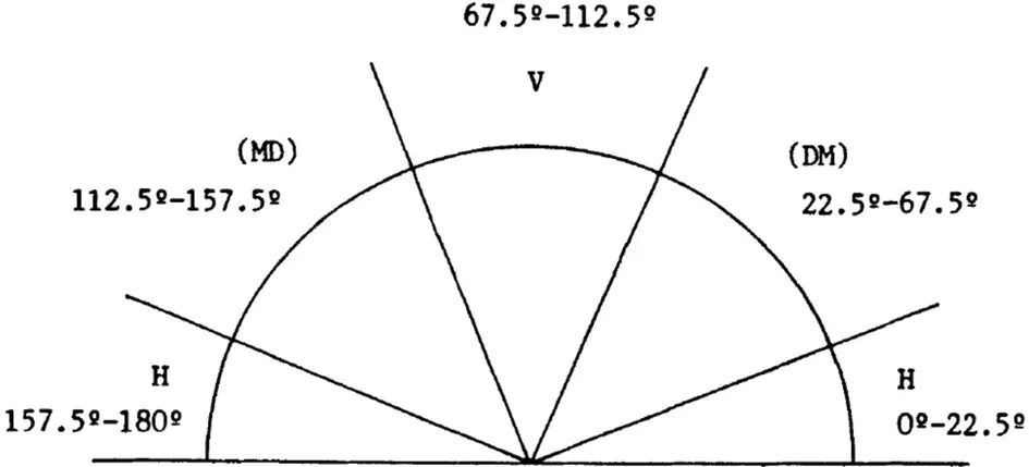 牙齿颊侧面不受咬合运动时上下颌牙齿之间相互触碰摩擦的影响,更能反映出牙齿微磨耗痕迹与食物类型之间的关系,是微磨耗研究中最佳的观察部位。笔者使用超景深三维显微系统(KEYENCE VHX-2000)对牙齿颊侧面微磨耗痕迹进行观察,首先利用固定橡皮泥使牙齿颊侧面与显微镜镜头保持接近完全平行,并在200倍镜头下选定视野最为清晰的1mm2面积作为观察范围,对该范围内的微磨耗条痕进行观察,运用显微系统生成每道条痕的长度和方向,最后输出统计结果并进行拍照。条痕在相对于牙齿咬合面的水平位置下包括四种不同的方向:垂直方向、近中咬合面至远中牙颈方向、远中咬合面至近中牙颈方向、水平方向。以右侧下颌牙齿颊侧面条痕为例,对其方向可做如下区分,见图一[7]。观察范围内所有条痕的长度和方向都列入统计范畴,所有数据都经过标准化处理并去除异常值。