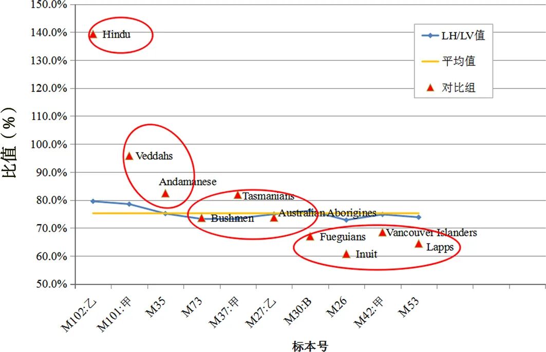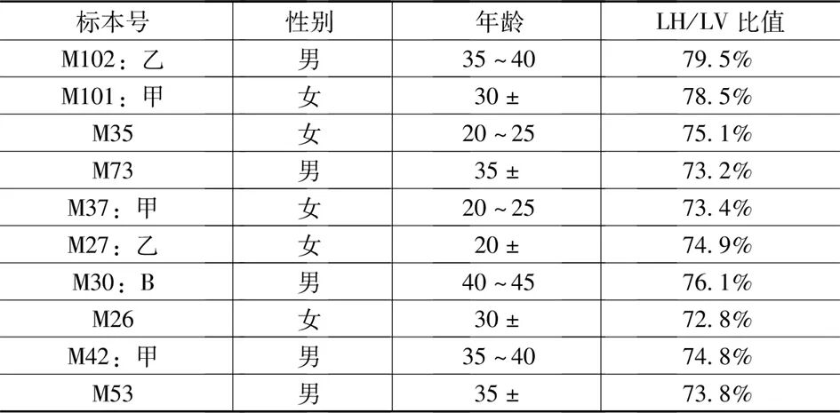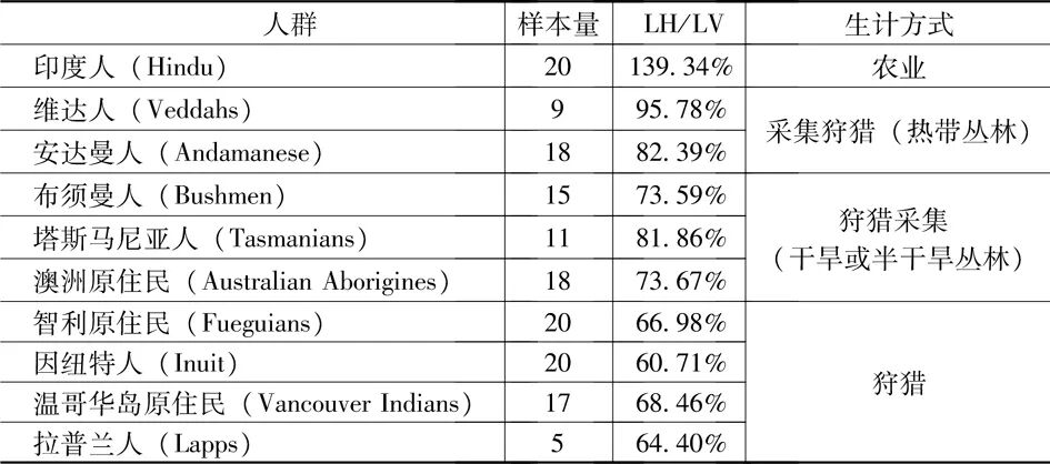 表二 现代原住民人群臼齿颊侧面微磨耗条痕的平均LH/LV比值