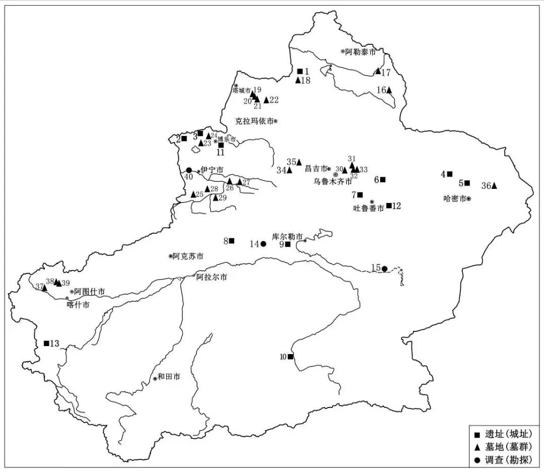 1 吉木乃县通天洞遗址;2 温泉县阿敦乔鲁遗址;3 温泉县呼斯塔遗址;4 巴里坤海子沿遗址;5 哈密市乌兰布鲁克遗址;6 奇台县石城子遗址;7 托克逊县小草湖遗址;8 库车县龟兹故城;9 巴州长城资源考古;10 且末县来利勒克遗址;11 博乐市达勒特古城;12 鄯善县吐峪沟石窟寺遗址;13 塔什库尔干县石头城遗址;14 轮台县两汉西域都护府遗址调查;15 尉犁县咸水泉古城;16 青河县萨尔托海水利枢纽工程墓群;17 富蕴县莫勒达拜墓地;18 和布克赛尔县G219国道沿线墓群;19 额敏县玛依塔斯墓地;20 额敏县霍吉尔特墓地;21 额敏县马拉苏墓地;22 托里县阿尔帕萨勒干墓地;23 温泉县哈夏沟Ⅲ号墓群;24 博乐市哈拉吐鲁克水库墓地;25 昭苏县大洪纳海墓群;26 新源县G218国道沿线墓群;27 尼勒克县G218国道沿线墓群;28 特克斯县康盖墓群;29 特克斯县喀甫萨朗四号墓群;30 阜康白杨河流域墓群;31 阜康市四工河墓地;32 阜康市黄山河墓地;33 阜康市泉水沟墓群;34 沙湾S101国防公路沿线墓群;35 石河子市十户窑村Ⅰ、Ⅱ、Ⅲ号墓群;36 伊吾县大白杨沟墓地;37 乌恰县康苏水库墓群;38 乌恰县克其克喀拉铁克宁萨依墓群;39 乌恰县琼帕斯阔尔滚墓地;40 霍城县惠远新、老古城