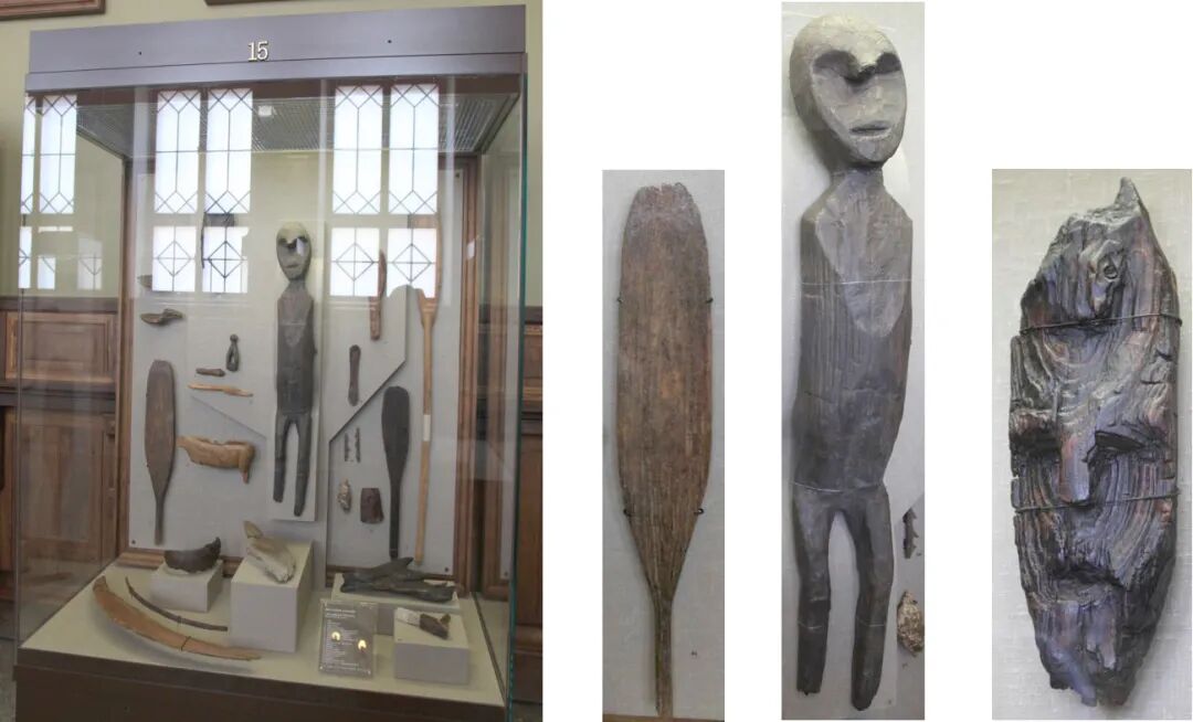 实证之一见于莫斯科红场附近俄罗斯历史博物馆。在其陈列文物中,有一组早期木质文物。其中有与小河墓地出土之象征女阴的桨形木雕,象征男根的柱形立木,鼻梁既高且大的人面形木雕,不具体刻画面部特征的人偶雕像(见图1),等等,与小河墓地出土文物类同。文物的说明文字称,文物出土于北高加索地区;文物的相对年代为考古文化中的“青铜时代”,绝对年代为“公元前3000~前2000年”。[8]图片中有限文物,显然不会是相关遗址出土文物的全部,但它们出土在“青铜时代”遗址之中,绝对年代在公元前3000~前2000年间。这些,又都具有与孔雀河青铜时代、尤其是小河墓地相关出土物的考古文化年代、绝对年代、文物造型相同,这就不是偶然的、一般的文化影响所可以解释的。它们最大可能应是具有相同文化观念、原始宗教信仰、活动时代也基本相同的一组人群,保留在不同地点的考古遗存。