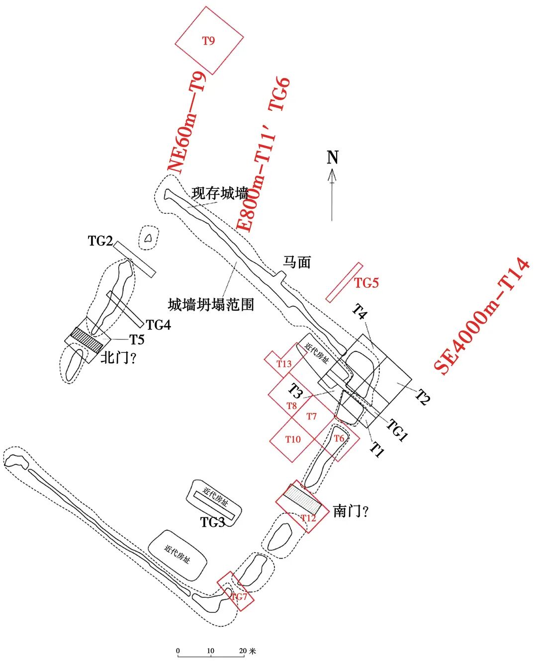 2.城门 北城墙中部有宽2.5米的豁口,豁口两侧(城墙内)均有夯土基址,基址与城墙属于同一时期,夯土中有红陶、白陶、灰陶陶片和兽骨。南墙中部亦有豁口,地表下夯土有宽3.4米的断裂,城墙外侧东西向的水沟在此处中断,虽未发现通过城门的道路痕迹,仍可推断为城门。不排除南北城墙均设置城门的可能性。