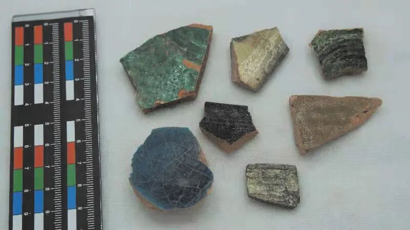 7.手工业作坊或街市 西城以东台地上陶片分布较多,有多处陶片密集区域。我们在西城东北约550米处布设探方T11(100平方米),此处地表上分布有两千多枚陶片,陶片密集、种类丰富,采集到红陶1312枚,黑陶554枚,绿衣陶171枚,兽骨残片60多块,钱币数枚。探方内有28座灰坑,多座灰坑之间有叠压打破关系,其中7座灰坑内出土铜币、铜饰、玛瑙珠、石块、金饰、玉饰、泥碗(未烧制)、红陶、釉陶(见图3)和动物骨骼,依据这些丰富的遗物,我们判断这里为手工业作坊区。这片手工业作坊区的陶器以红褐色夹砂陶为主,多有红衣、黑衣、绿衣或黄衣;多见扳耳、执耳、带流、平底器;釉陶以碗、碟类等小型陶器为主,内外壁或器表施釉,主要以细泥为主,有黄色、深绿、蓝色、草绿和白色等多种色彩。我们在这一发掘区地表和地层中得到三千余件陶片,其中红褐陶1863件(含红衣陶),黑陶750件(含黑衣陶),绿衣陶282件,灰陶93件,釉陶15件,这些陶片有显明的地域特色与时代特征。