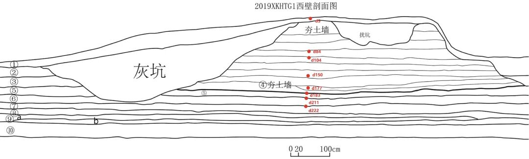 图5 汗诺依遗址地层、西城南城墙剖面及采样点
