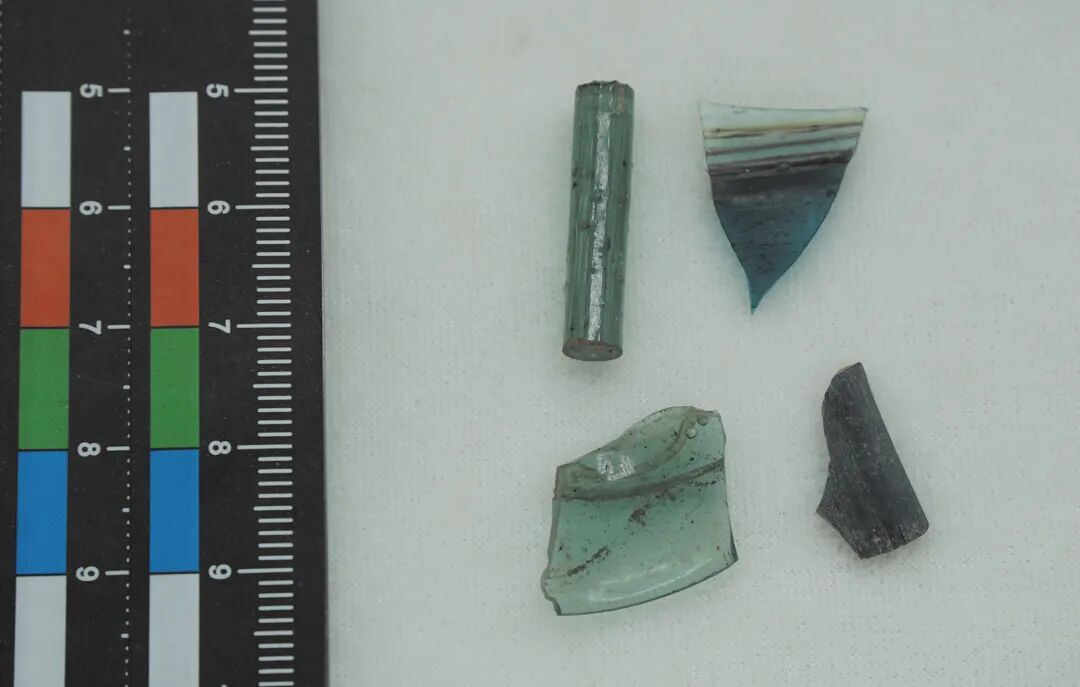 我们在遗址地表采集到玻璃残片百余件(地层中亦有数件),大小在1~3厘米之间(见图4),形状、厚薄不一,有浅绿、黄色、蓝色、粉色及灰白相间等多种色彩,显示着玻璃制作工艺达到一定水平,可能包含了吹制生产的钾钙硅酸盐玻璃。[3]多处遗址地表发现水银瓶残片,这是研究西域彩色玻璃的规模性生产与用途的重要发现。[4]