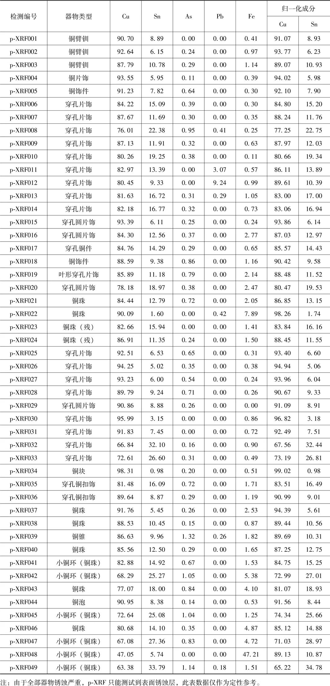 结果见文后附表。除p-XRF011和p-XRF012两组数据中Pb含量>2%外,其他组分As和Pb含量均在2%以下,可认定为微量元素,显示这批铜器主要为铜锡(Cu-Sn)合金。
