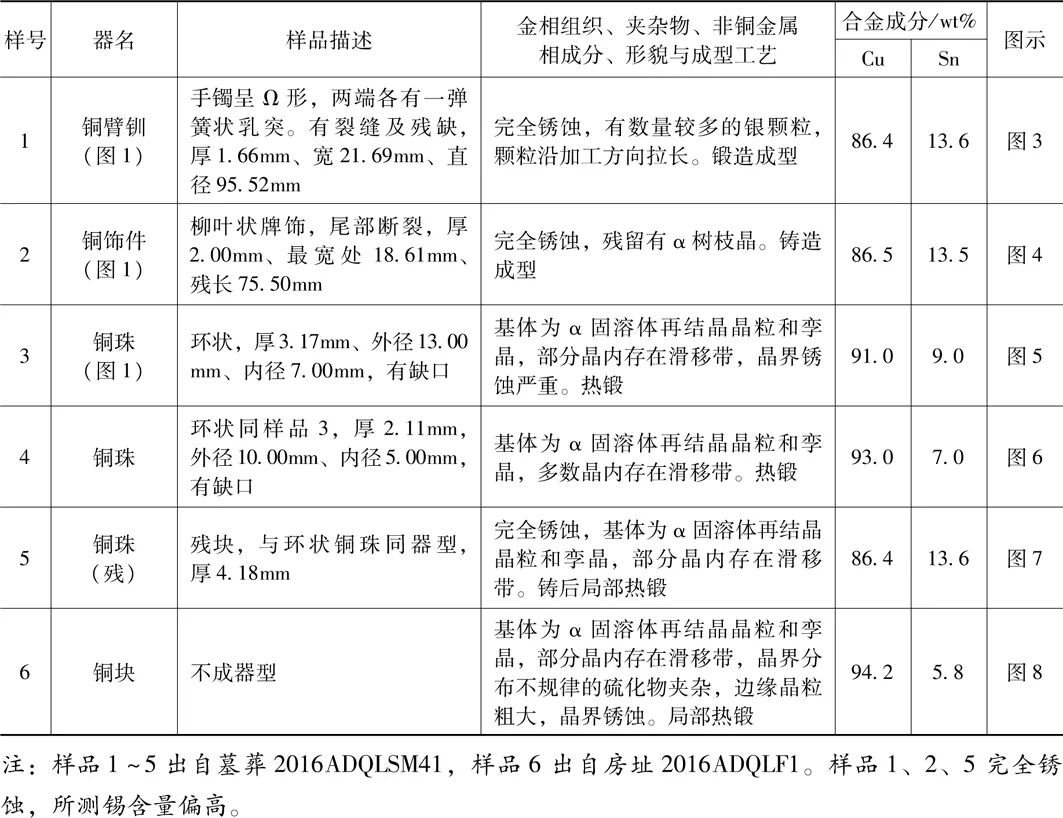 阿敦乔鲁遗址出土的铜器几乎全部为装饰品,大致可分为三个类型:臂钏、穿孔片饰、铜珠。本文所选取的6件铜器,其中5件从以上三个类型中选取,另一件不成器型。根据样品的金相观察及成分分析可以发现:在材质方面,铜器样品全部为锡青铜;在成型工艺方面,片饰为铸造成型,其他均采用热锻工艺制作。