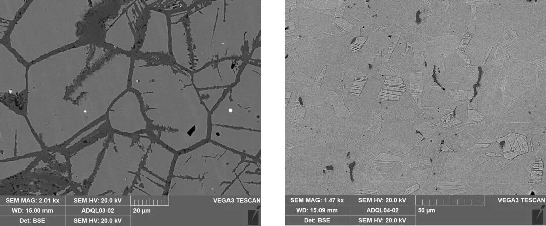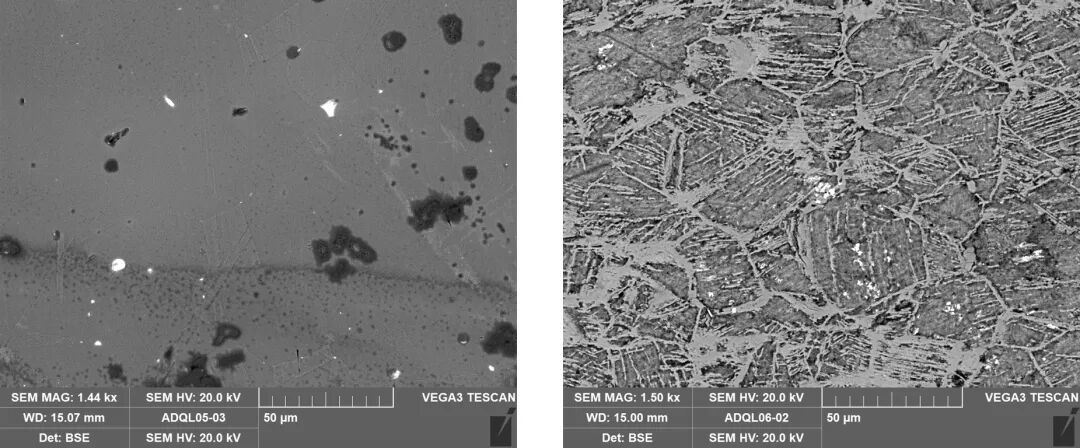 图4(右) 样品2扫描电镜背散射电子图像,残留有α树枝晶,其中的白亮相为银,未见其拉长变形。