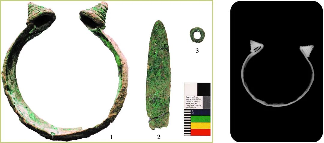 阿敦乔鲁遗址F1及墓地使用年代在公元前18世纪至公元前16世纪范围内,使安德罗诺沃文化共同体在东部地区的年代认知提前了数个世纪。[8]阿敦乔鲁出土部分铜器的锡含量在5%~14%之间,考虑到大部分铜器完全锈蚀导致锡含量偏高的因素,这个分布区间是符合所谓安德罗诺沃铜器锡含量在3%~10%之间的特点。安德罗诺沃文化的耳环和镯饰经常有螺旋状的尾端,其生产都应用了高水平的锻造技术,[9]新疆所发现的这4件臂钏无论器型或技术工艺都符合上述特点。考虑到与臂钏同出的釉砂是通过欧亚草原更大范围的交流互动背景下引入的,[10]推测阿敦乔鲁等遗址的铜器可能也由同样的方式出现在新疆,而非本地生产。