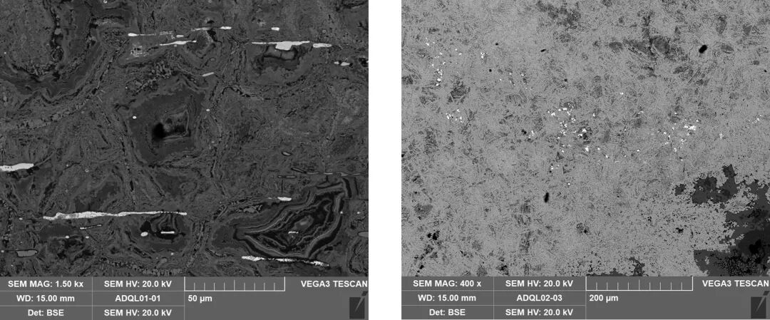 图3(左) 样品1扫描电镜背散射电子图像,其中的长条状白亮相为银,银锻造加工而拉伸延长。
