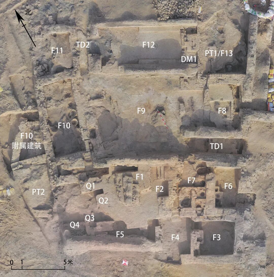F1,分布于南组(栋)建筑的最上层,为最晚期的建筑遗迹,残存露出的北墙和一段隔墙,及表土层下埋藏极浅的少量地面。呈东西向长方形,残存2间。对晚期扰坑剖面的观察及残存F1东北角、西北角区域的解剖表明,F1是利用F2墙体及倒塌堆积改建的晚期房屋,包括对F2北墙的加厚加高,对F2门道的完全封堵,以及用倒塌堆积填充F2原有空间后再行平整为F1地面等。在填充地面时,F1的建造者使用了拆自较早期仪式性设施的壁画残块。