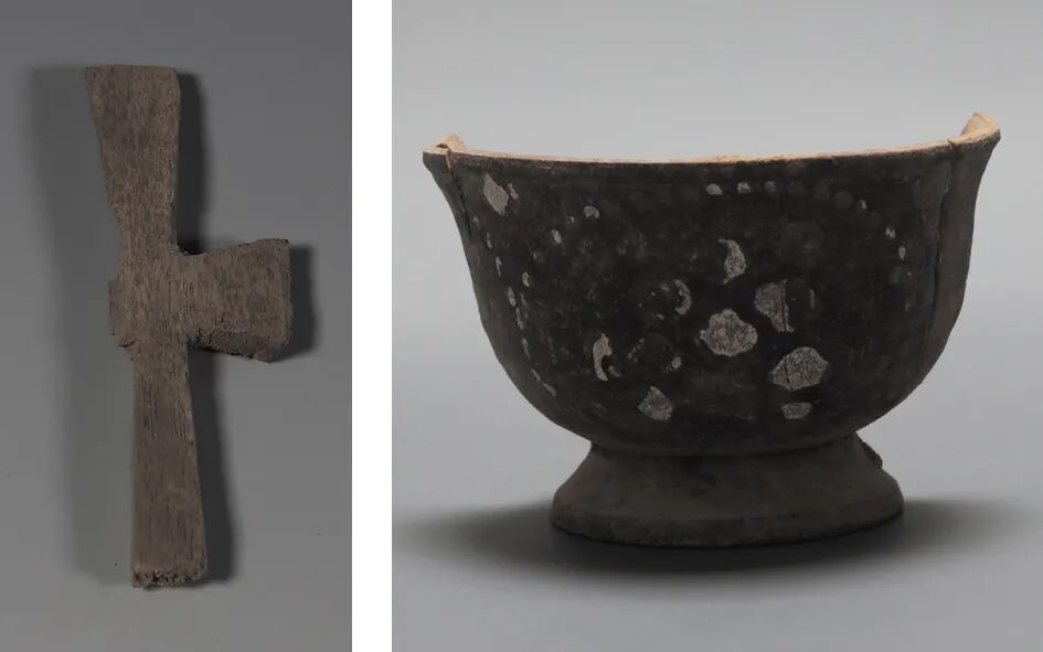 在其他遗物中,数量最多的是木器,包括十字架(图五)、穿孔柄状器(似乎某种琴上挂弦的柱)、建筑构件、钵、杯、碗等(图六)。部分木器器形在过往考古工作中未曾发现,实际功能不明,部分可能为宗教法器。陶器包括缸、瓮、罐、盏等,但是可修复者数量不多。1块陶片上保存有回鹘文题记。在若干葫芦片上也保存了可能是回鹘文的墨书题记。出土的钱币除1枚宋代熙宁元宝外,其余均为清代钱币。