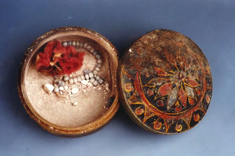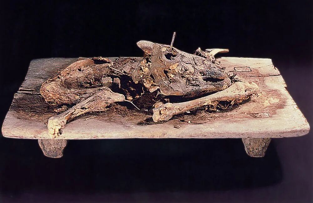 营盘遗址位于孔雀河故道北岸,是由城址、墓地、佛寺、烽燧、农田等遗迹组成的大型聚落遗址,处于塔里木盆地东部东西、南北交通线的十字路口,是汉晋时期“楼兰道”上的重镇。营盘墓地是楼兰地区面积最大的一处墓地,1995年抢救性发掘墓葬132座,1997年进行干尸整理。墓葬有竖穴和偏室墓,使用木制棺具,单人葬为主,出土保存状态良好的各类服饰及大量木器、漆器、铜饰、玻璃制品等。其中15号墓备受关注,墓主为一男性,葬在汉式彩棺中,棺上盖异域风格狮纹毯,其面戴麻质贴金面具,所穿人兽树纹毛锦袍,鲜艳如新,华丽奇特,堪称稀世瑰宝。该墓棺具、墓主人服饰规格高,显示其生前可能有着不同寻常的身份、地位。