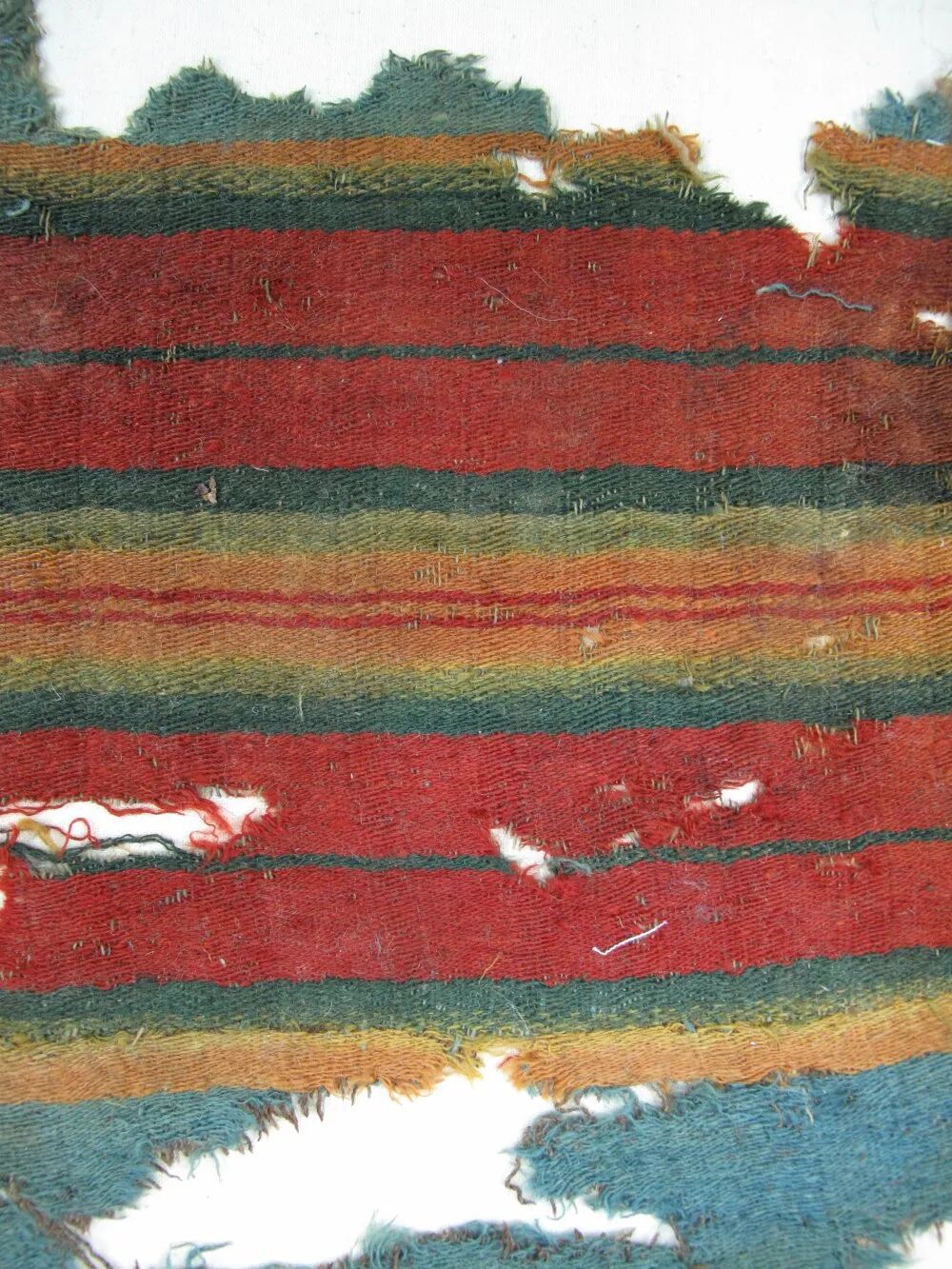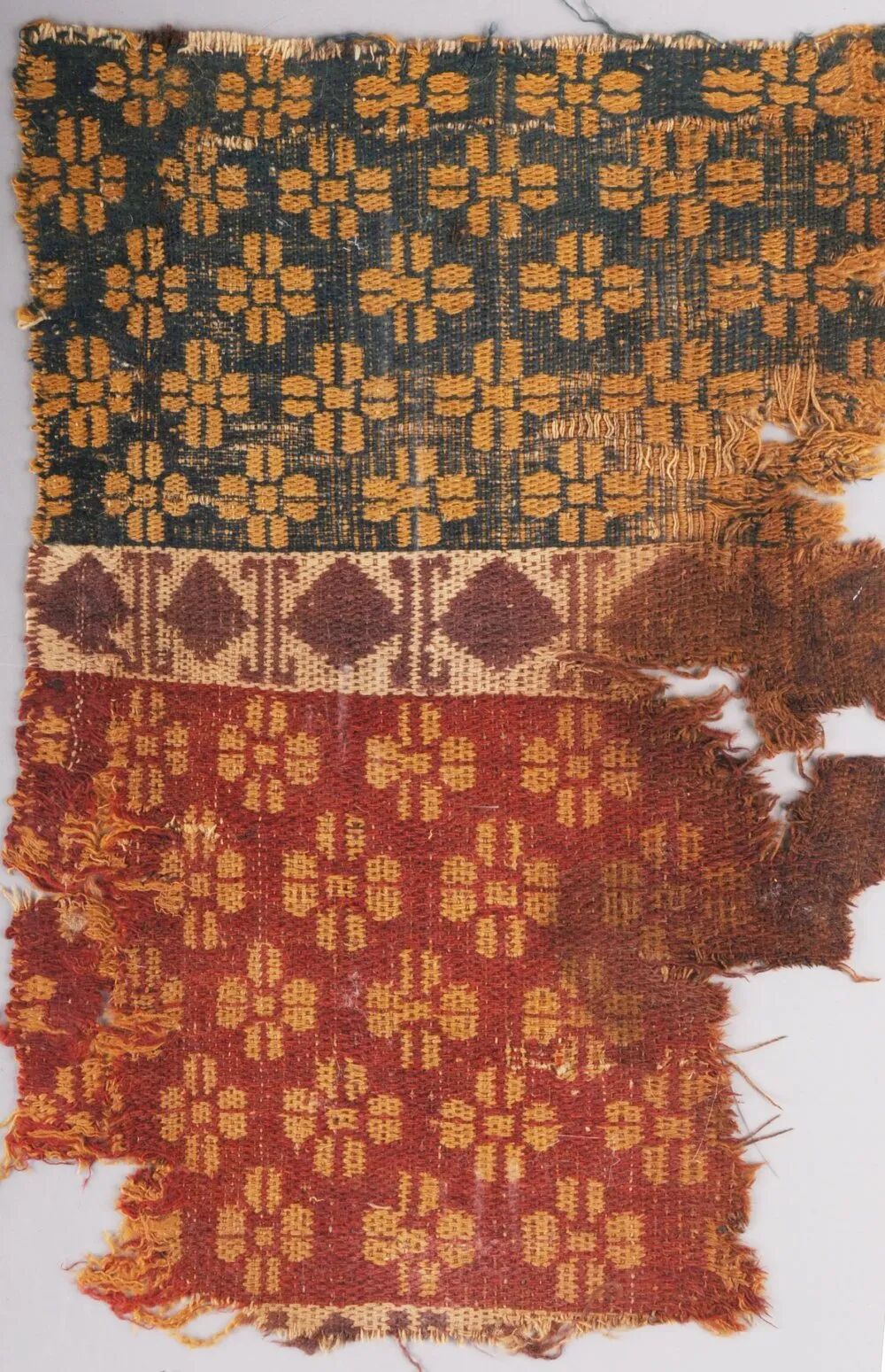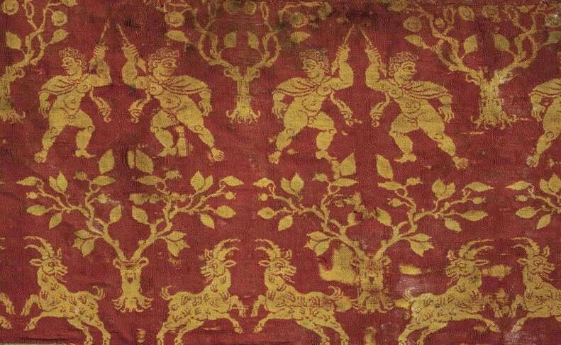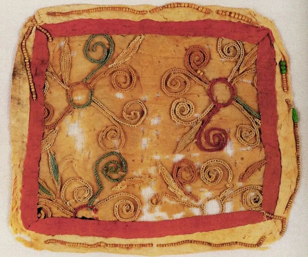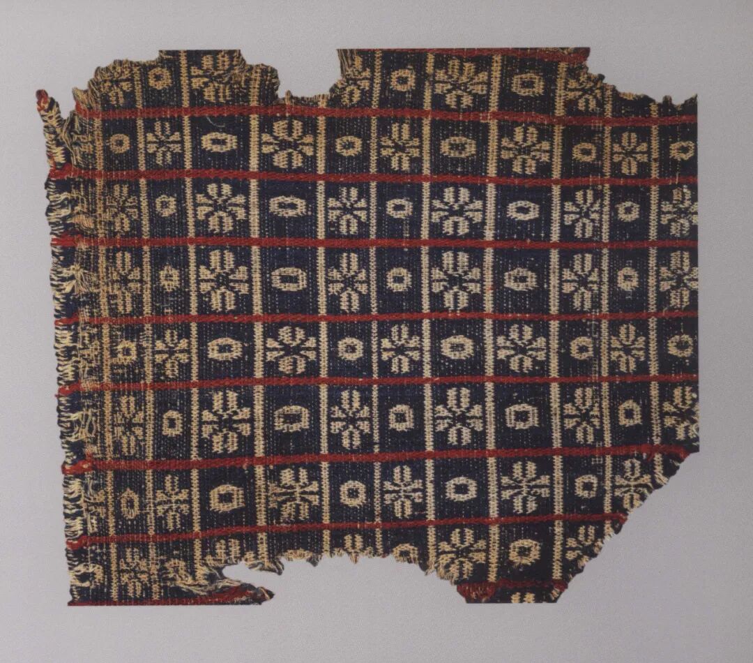 毛织物是西域传统的服装面料,营盘出土的毛织物品种丰富,有普通的平纹、斜纹的粗毛布,还有受中原丝绸织锦技术影响,当地织造的复杂组织的提花毛布、毛褥等。