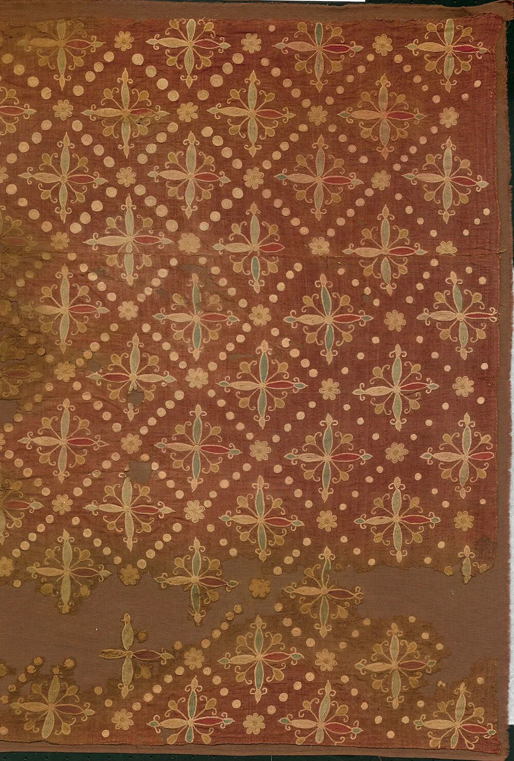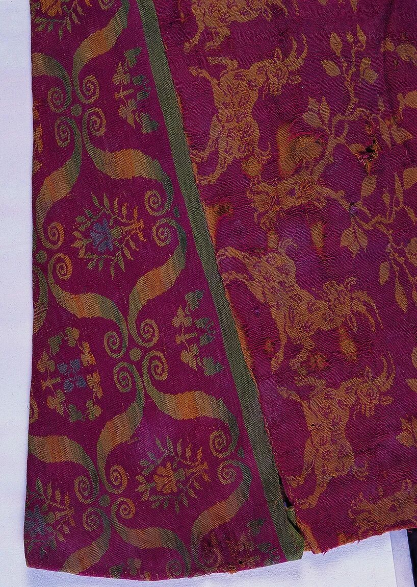 拼缝在衣襟处的卷藤花树纹毛锦