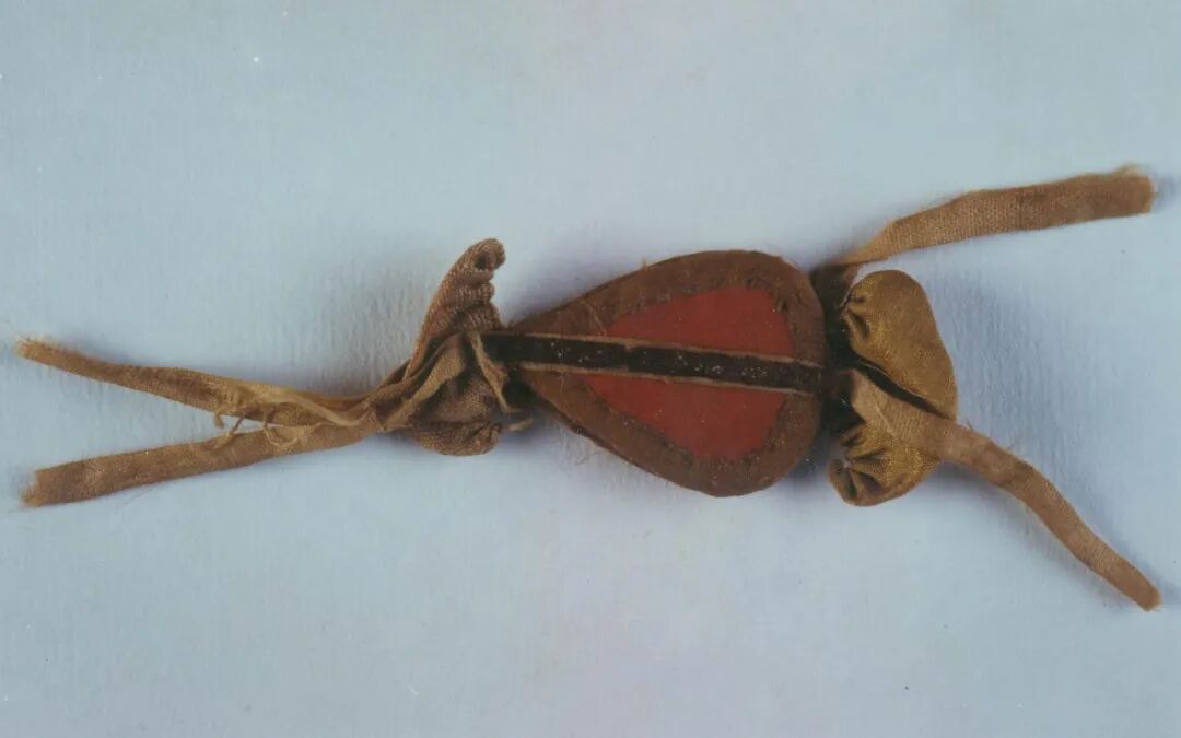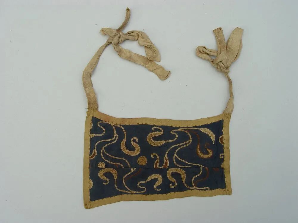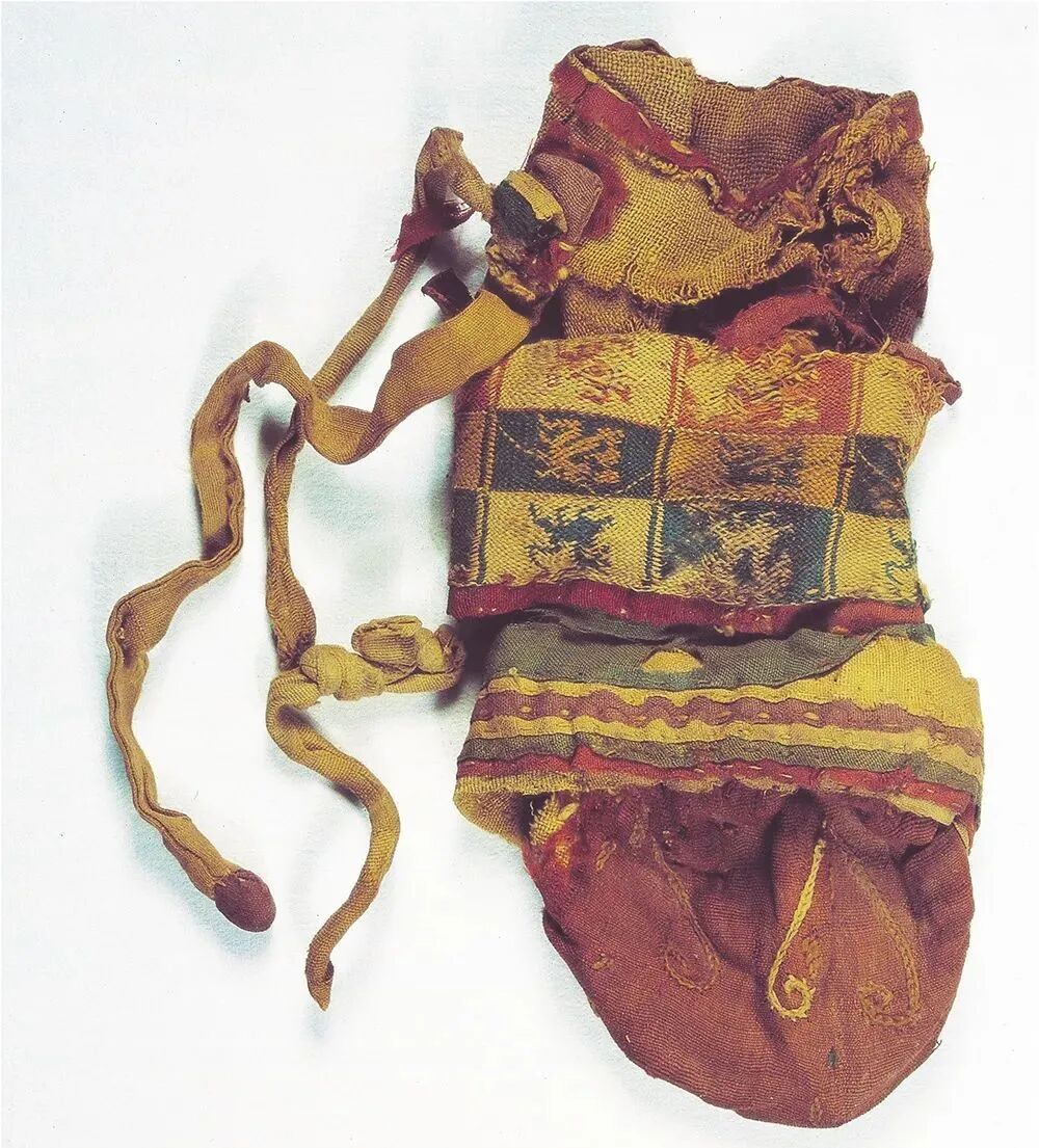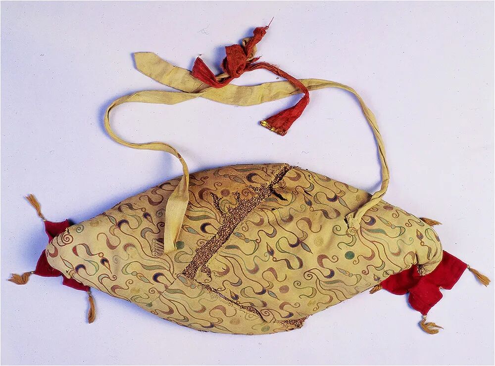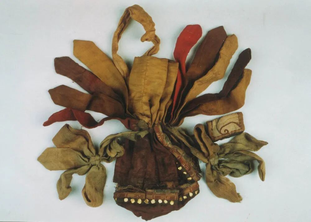 男子腰间系绢带,上挂一件用丝绸贴金香囊,一件丝绸帛鱼,胸前及左腕处各放一件丝绸缝制的小冥衣,头下枕四角缀珍珠的暗花丝绣枕。其中帛鱼似有祈求子孙兴旺的寓义;冥衣则象征备足四季之衣,供死者在另外一个世界享用。