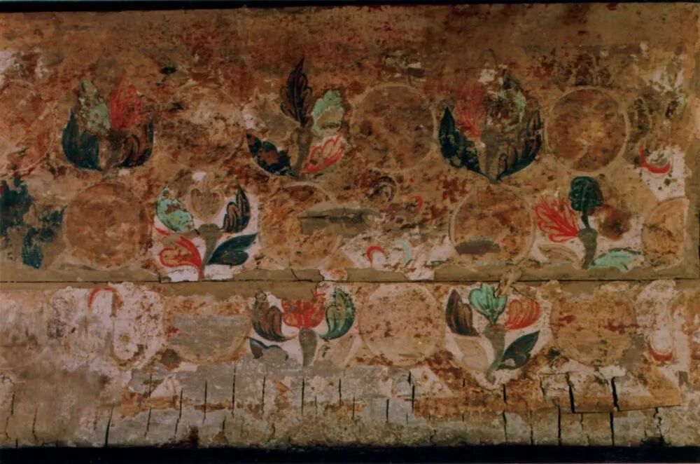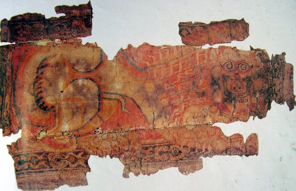 15号墓四足箱式彩棺,彩绘题材为中原常见的穿璧、流云以及西域特色的石榴花、花瓶纹样,可谓中原与西域艺术的合璧。棺上盖狮纹栽绒毯,使用十几种色彩毛线织出呈匍匐状的雄狮,动感十足。毯面绒头磨损不明显,当为壁挂毯。