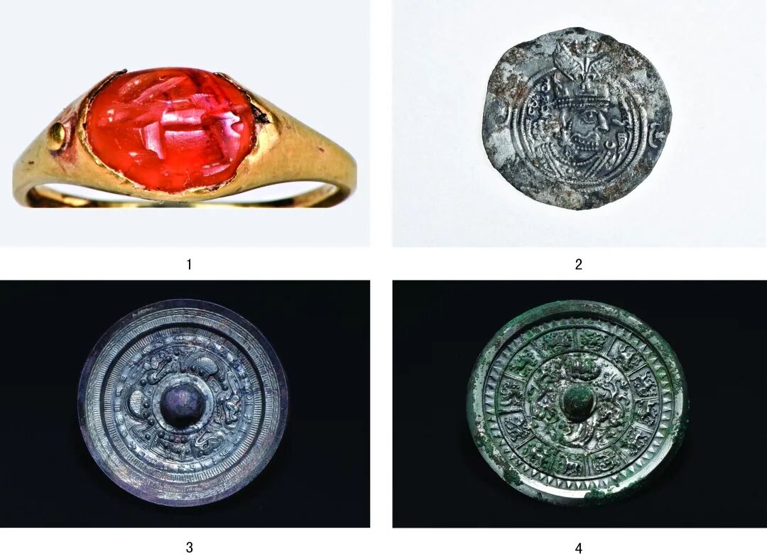 1.金戒指(M22:5)(戒面兔形图案);2.萨珊波斯银币(M2:1)正面;3.“上方作竟”龙虎纹镜(M35:3);4.四神十二生肖镜(M25)