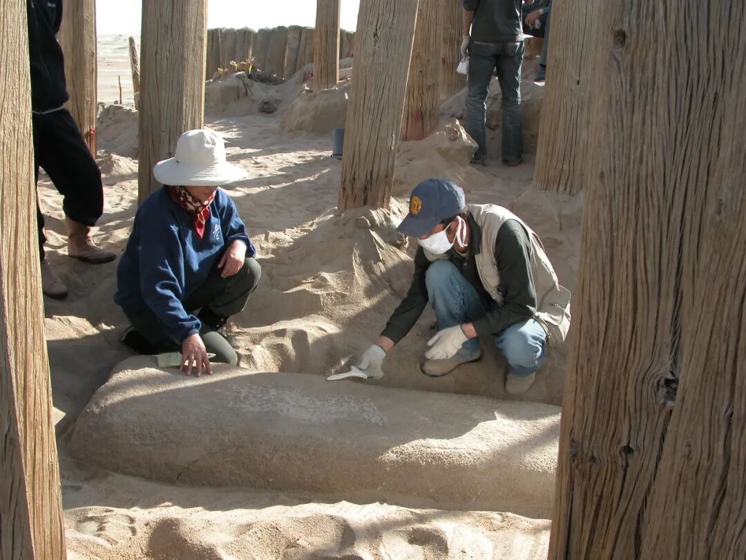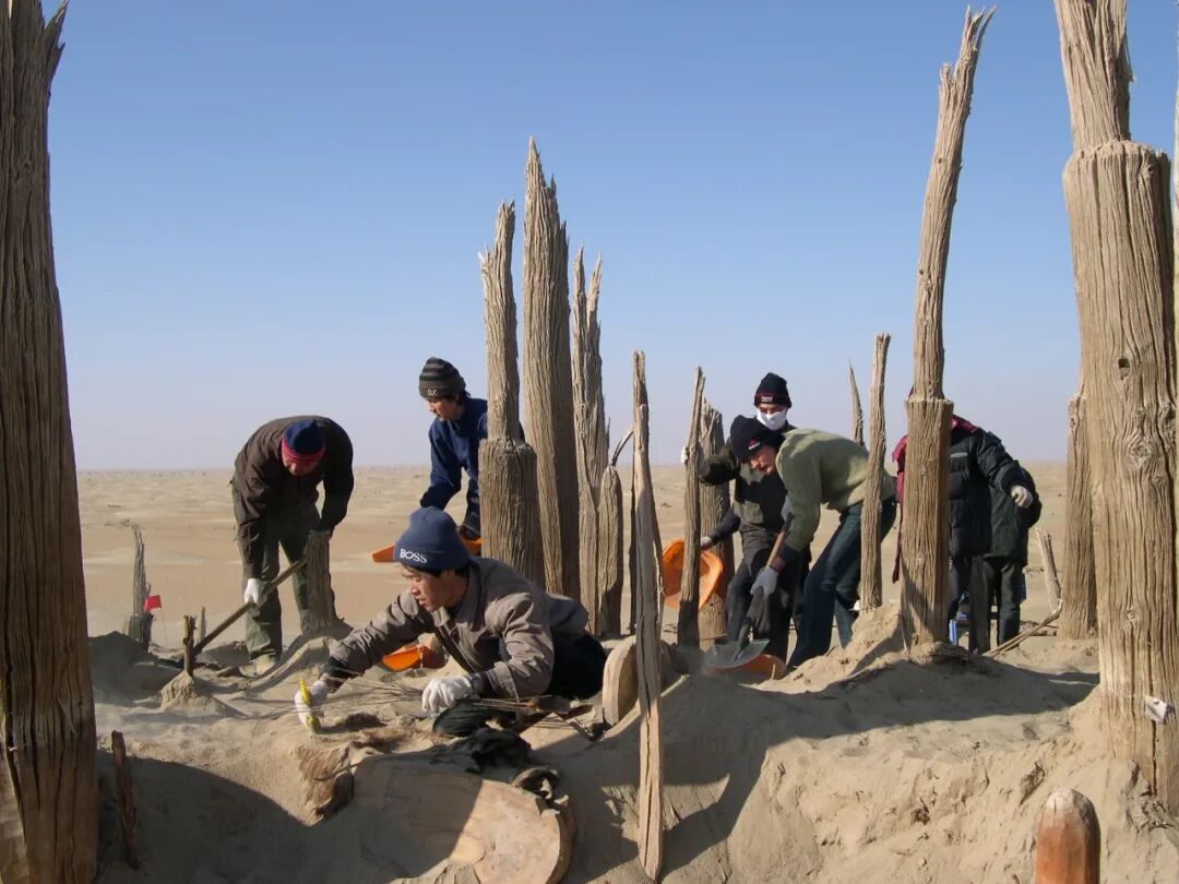 小河墓地深处罗布泊西南荒漠,是夏商时期塔里木盆地独具特色的青铜时代文化遗存,年代距今约3400-4000年。2002-2005年对该墓地实施全面发掘,发掘墓葬167座,采集30多具保存完好的古尸标本及数以千计的珍贵文物。大部分墓葬还保持着埋葬时的原貌,完整保留了当时社会诸多方面的信息。发掘显示,墓地由不断构筑的五层以上的墓葬叠垒及在此过程中的人工堆沙、自然积沙共同形成,其遗存形式在中外考古中前所未见。通过发掘,基本廓清墓地布局、不同层位墓葬早晚文化特征,对于研究当时社会结构及其演进具有重要价值;发现许多奇特的埋葬现象,如棺前竖立男根女阴立木、具有祭祀功能的泥壳木棺墓、堆放七层牛头的木房式墓葬、成排布列的奇异“木尸”等,为研究原始宗教、巫术提供了宝贵的第一手资料;出土大量人类及动物遗骸和植物标本,奠定了生物人类学、遗传学、环境考古学等多学科深化研究的资料基础;染织服饰、小麦、粟、小铜件等发现,对史前东西文化交流中相关问题的探索,也有重要启发。