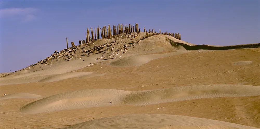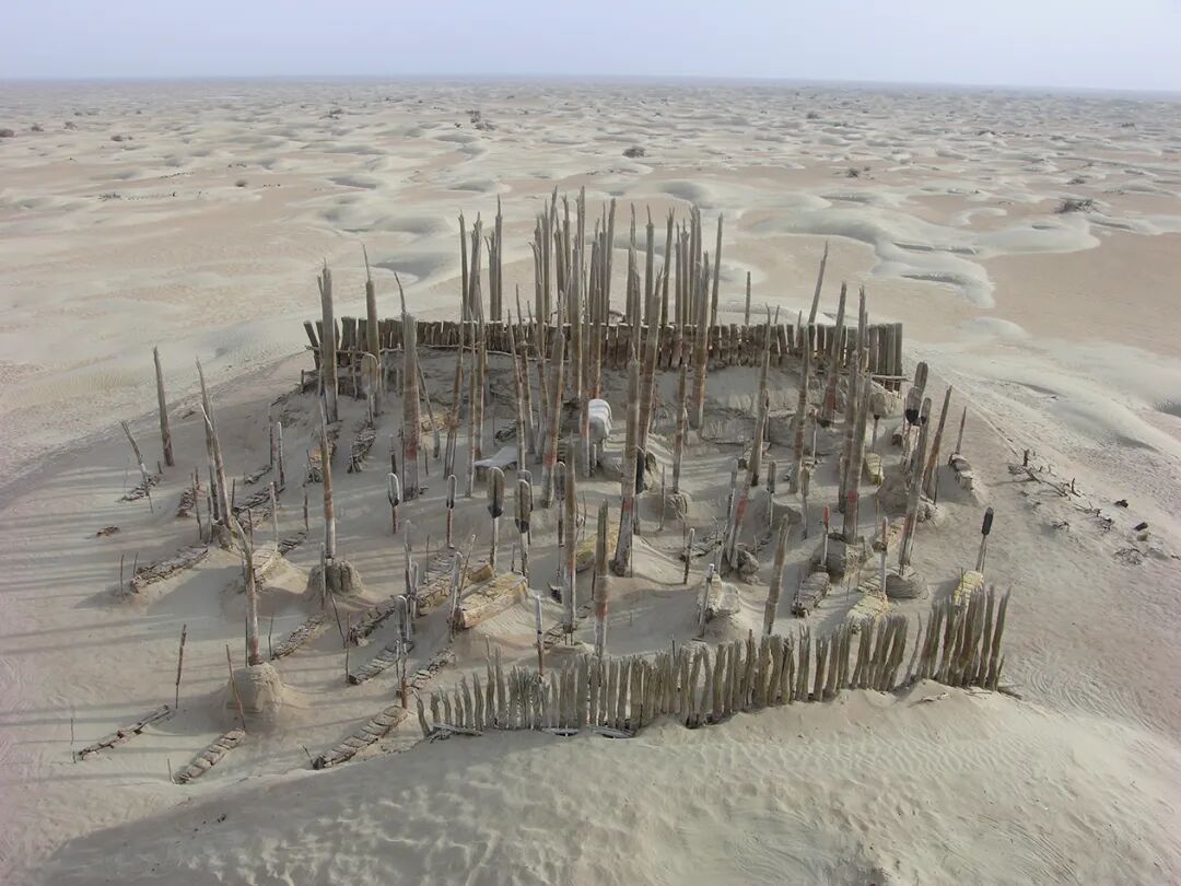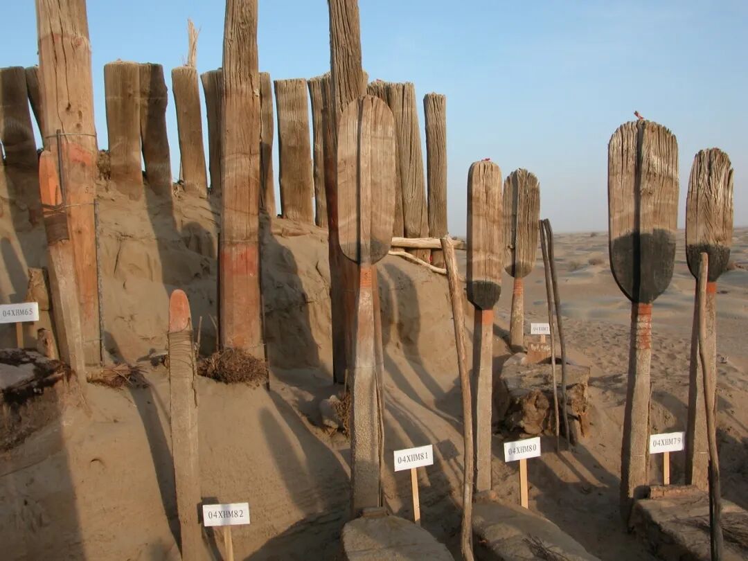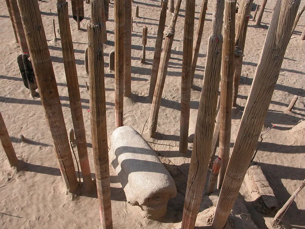 小河墓地不同时期的立柱高低丛列,形成一片红色的木柱森林。600余年间,一代又一代小河人在墓地沙山上,安葬逝者,举行祭祖祈育的神圣活动,希冀祖灵佑护,祈盼生命繁衍、万物丰产。