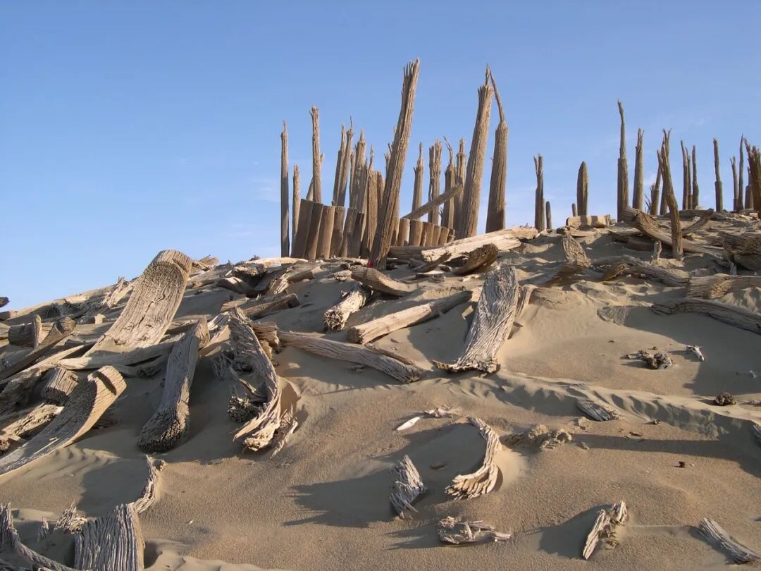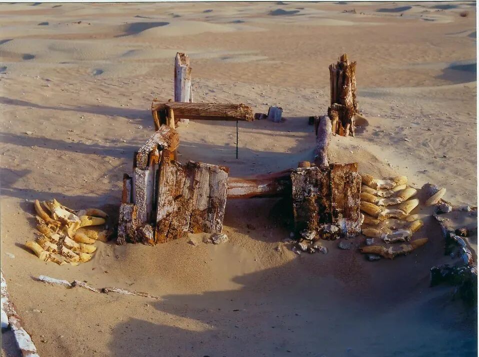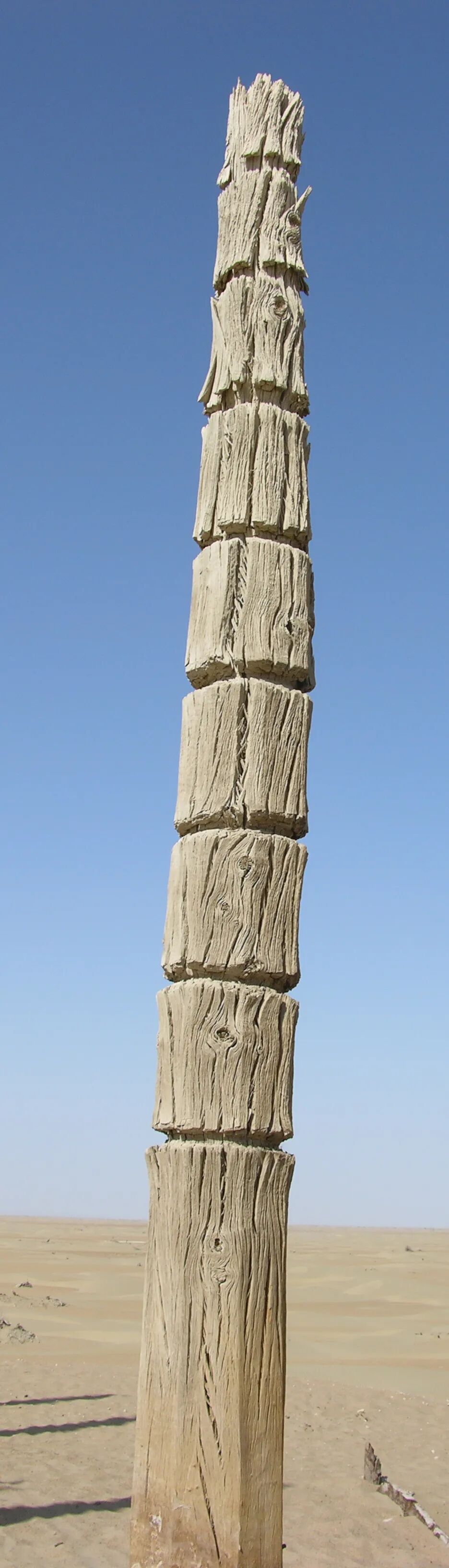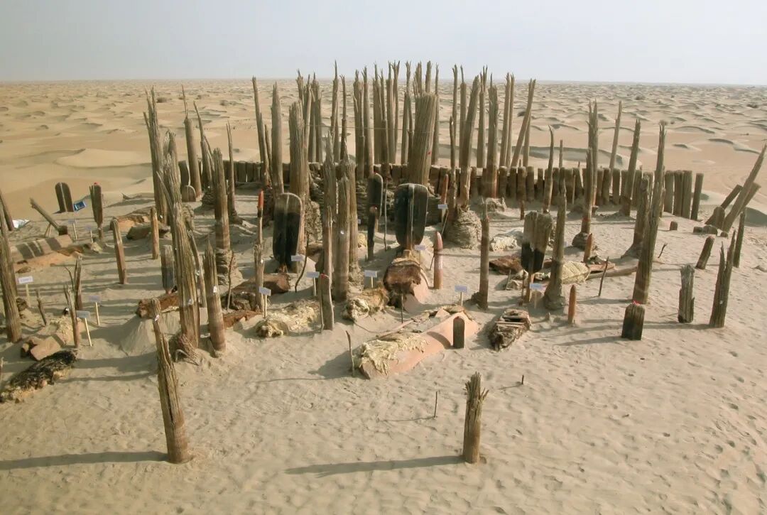 小河墓地不同时期的立柱高低丛列,形成一片红色的木柱森林。600余年间,一代又一代小河人在墓地沙山上,安葬逝者,举行祭祖祈育的神圣活动,希冀祖灵佑护,祈盼生命繁衍、万物丰产。