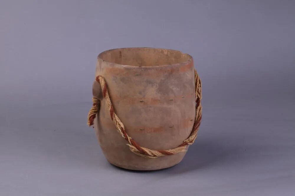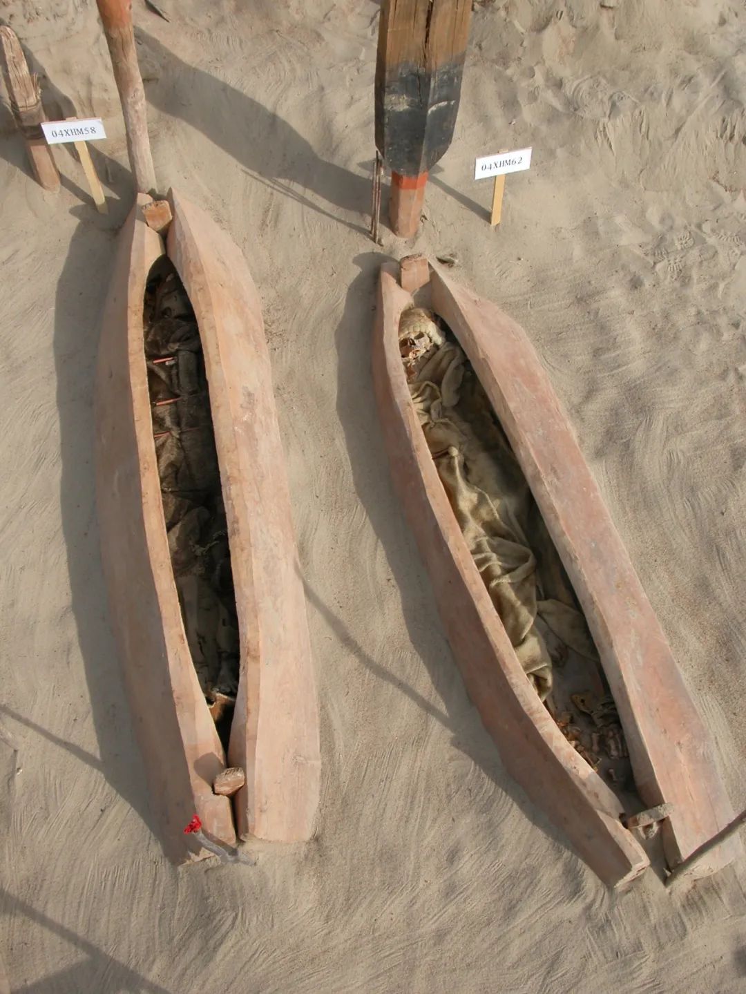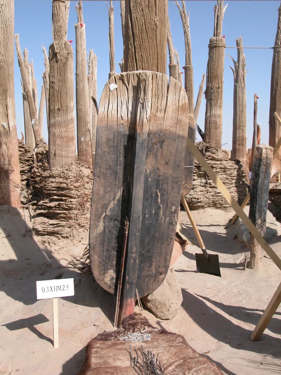 墓地多数墓葬结构一致,挖沙坑、置棺具、棺前栽竖立木、木柱。一墓置一棺,木棺形似无底的独木舟,棺盖板上蒙盖牛皮。男性棺前立木似桨,桨面涂黑、桨柄涂红;女性棺前立木多为棱形柱,上部涂红,密缠一段毛绳,绳下固定草束。据研究,多棱形柱象征男根,“桨”象征女阴,而无底的舟形棺则可能也是女阴的抽象符号,它们彼此呼应,朴素直观地表达着小河人的生殖观念以及根植于社会文化中的生殖崇拜信仰。
